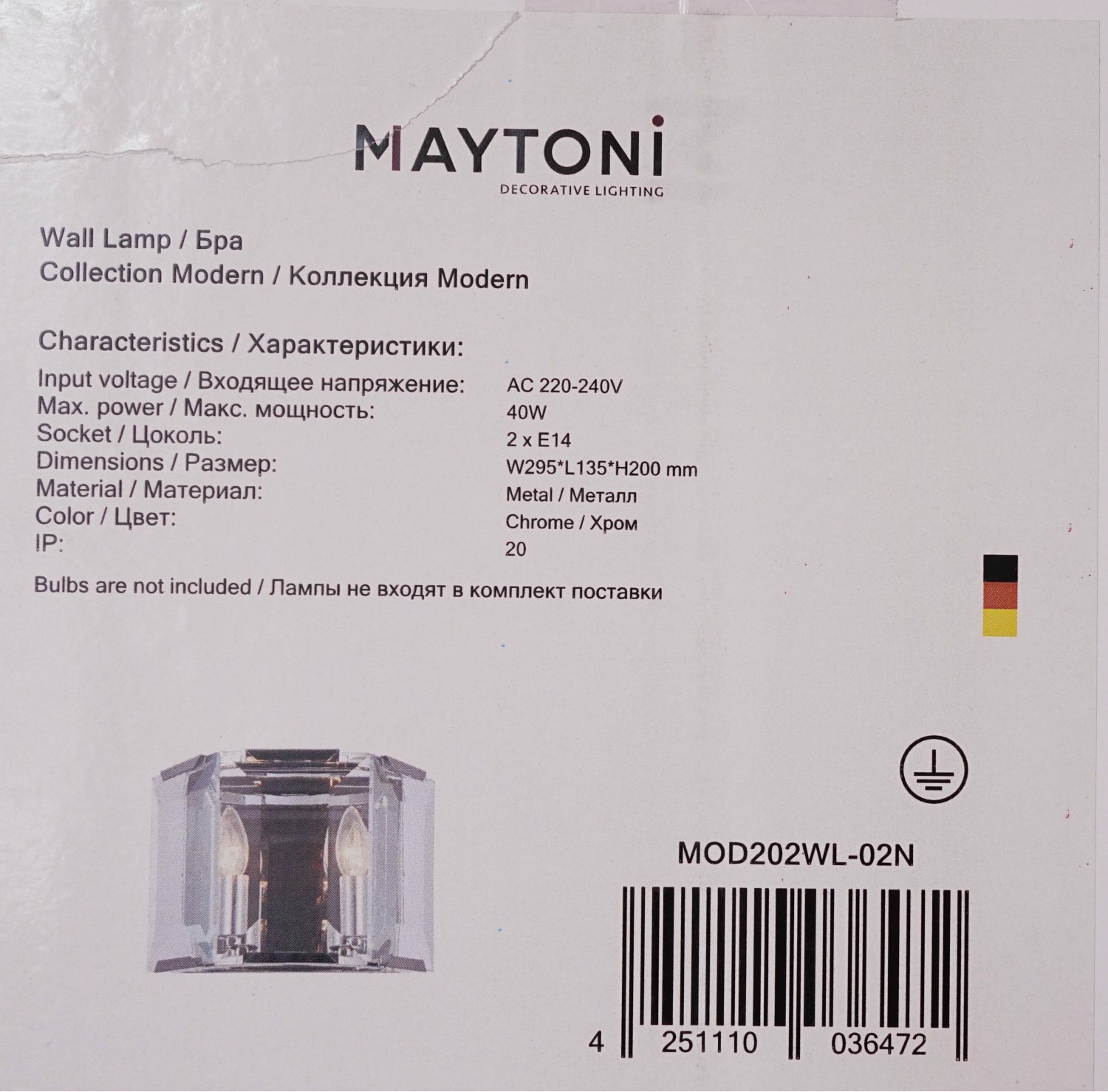 | Максимальная допустимая мощность лампы (Вт) | 40 |