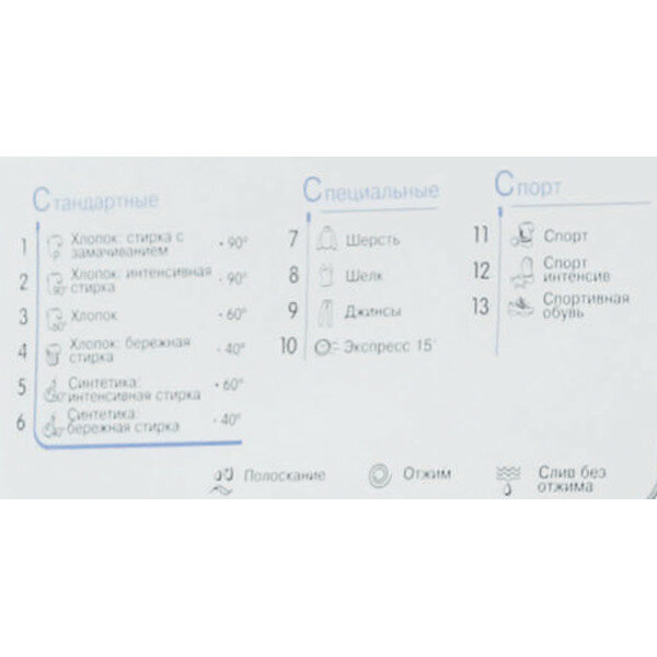 | Автоматические программы | синтетика (2 программы), джинсы, спорт (3 программы), хлопок (5 программ), шерсть, шелк |