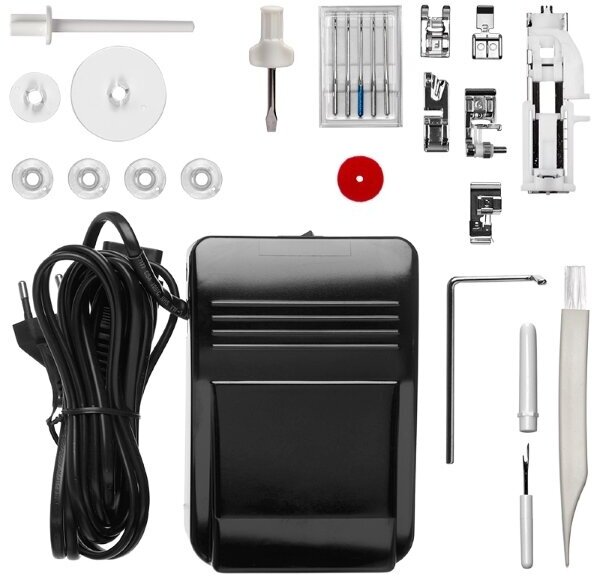 | Комплект поставки | отвертка маленькая; отвертка большая; вспарыватель; масленка; шпульки; лапка для вшивания молнии; лапка оверлочкая; лапка подрубочная; лапка для автоматического выметывания петель |