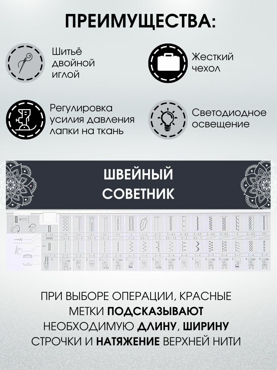 Рамная конструкция повышает надежность машины, снижает вибрацию и шум во время работы. С моделью поставляются также большая и маленькая отвертки, вспарыватель, масленка, шпульки, лапка для вшивания молнии, оверлочная и подрубочная лапки.