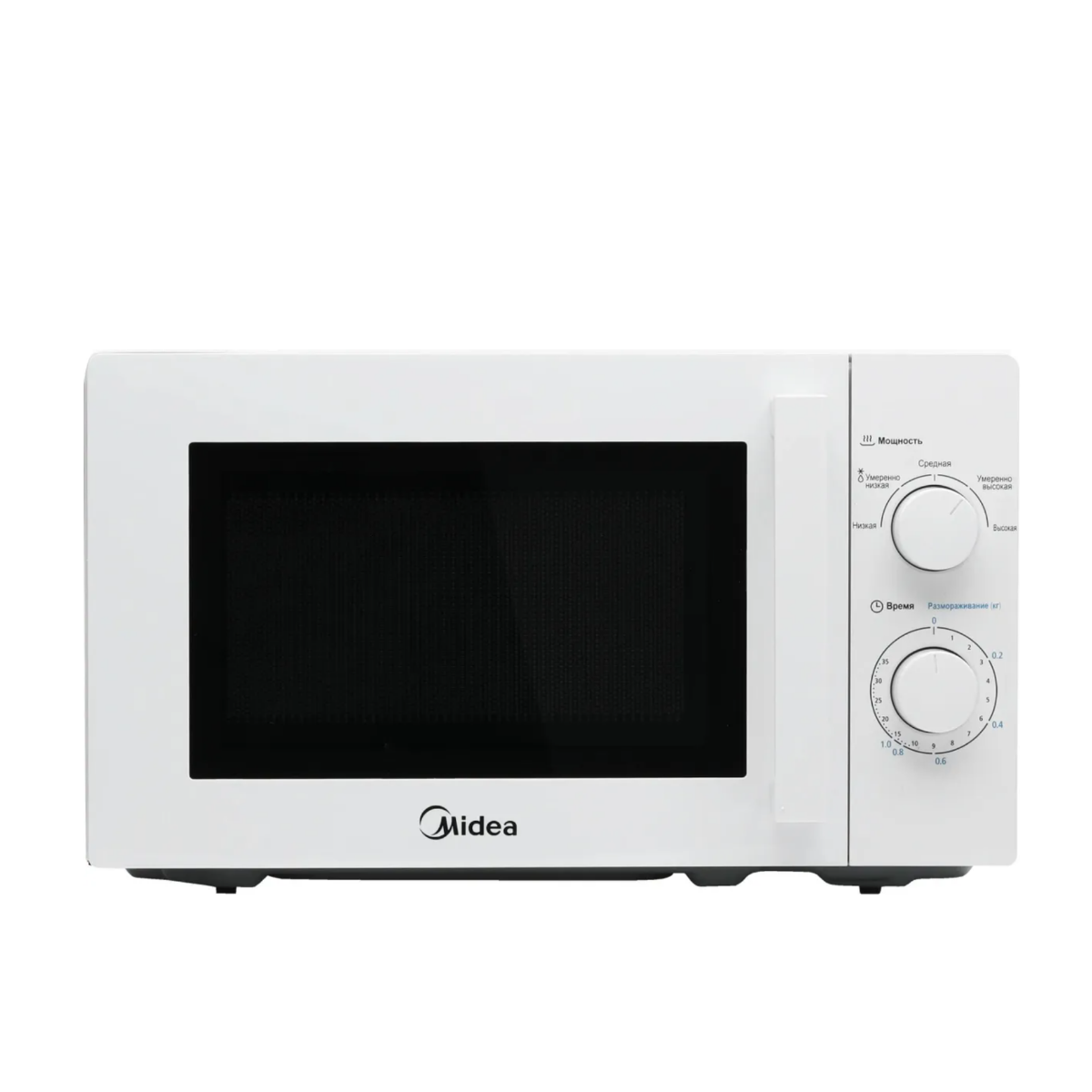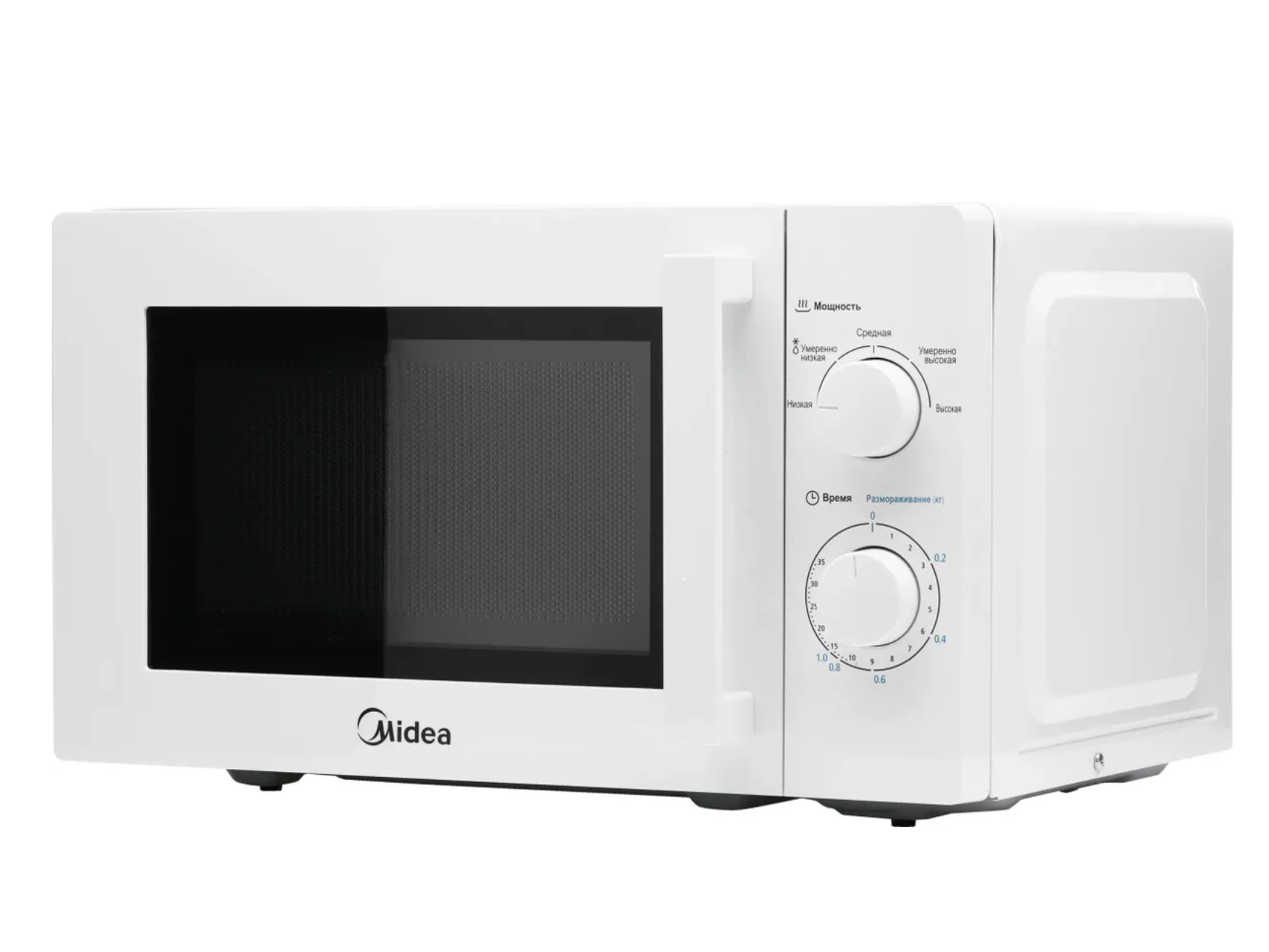 Микроволновая печь соло Midea с объемом в 20 л может быть установлена на любой ровной поверхности. Управление – механическое, представленное в виде двух поворотных переключателей. Возле каждого переключателя указан выбор режимов. По окончанию выполнения заданной функции срабатывает громкий звуковой сигнал, и устройство автоматически выключается. Также пользователю предоставляется возможность регулировки уровня мощности.