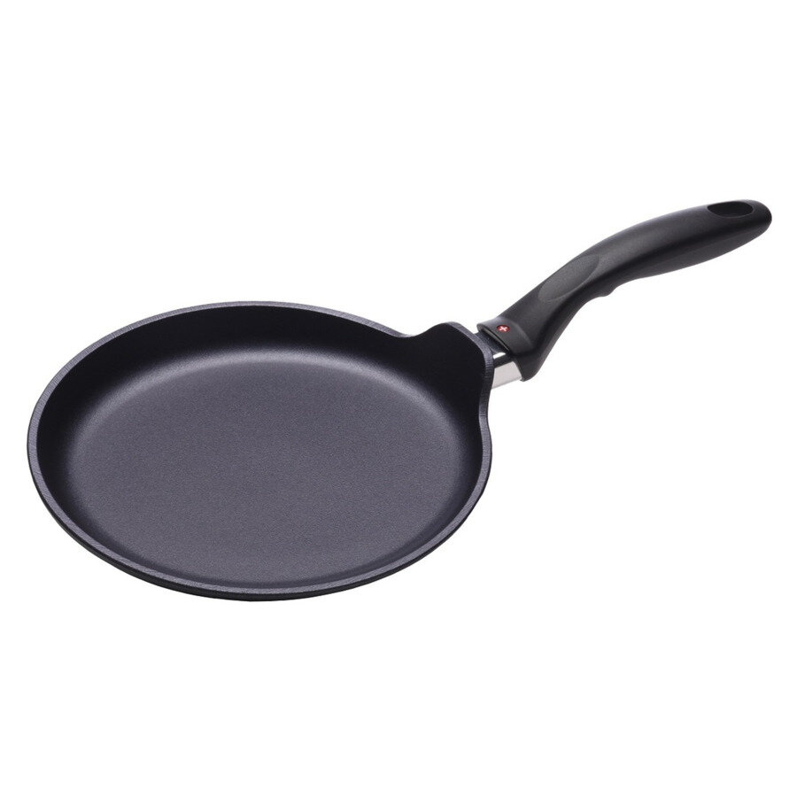 Swiss Diamond Сковорода блинная 24 см Уникальность антипригарного слоя от Swiss Diamond заключается в непревзойденных физических свойствах настоящих кристаллов алмазов, которые входят в состав нанокомпозитного покрытия. Алмаз является самым твердым природным материалом, что обеспечивает максимальную прочность и долговечность рабочей поверхности. Кроме того, теплопроводность алмазов в несколько раз повышает теплопроводность меди, алюминия и стали, что гарантирует быстрый нагрев посуды, и идеальное распределение тепла. Преимущества: Высочайшие антипригарные качества уникального покрытия из нанокомпозита, содержащего кристаллы настоящих алмазов. Идеальное распределение тепла за счет свойств алмазов. Высокая сопротивляемость к механическому повреждению — возможность использования неострых металлических приборов и чистки в посудомоечной машине. Максимальный комфорт и устойчивость благодаря удобной форме отлитого под давлением корпуса из сплава алюминия и кремния, предназначенного для изделий пищевого назначения. Идеально ровное основание для использования на электроплитах, в том числе со стеклокерамической поверхностью, а также на газовом огне. Эргономичные ручки из термостойкого бакелита, разработанные с учетом необходимого противовеса, позволяют использовать посуду в духовке при температуре до 260 °С.