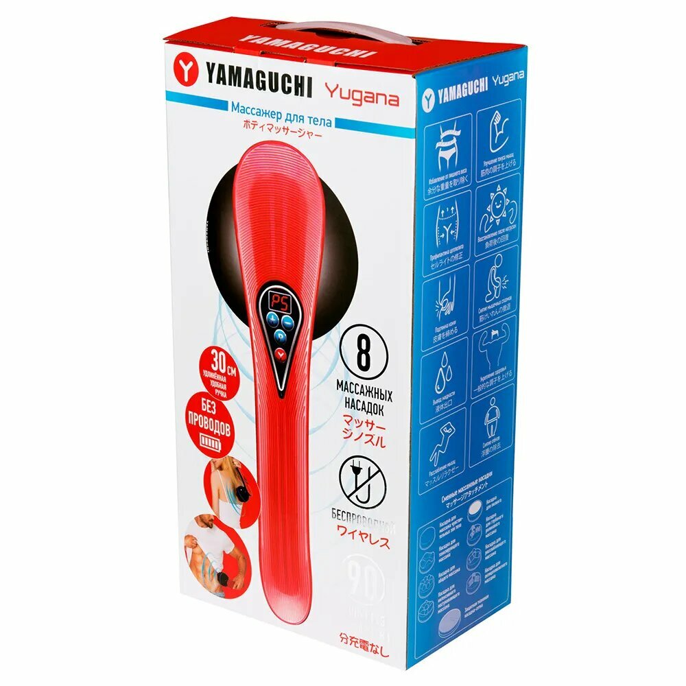 YAMAGUCHI — многофункциональный беспроводной массажёр, который быстро снимает напряжение с любого участка тела, улучшает кровообращение, снижает в мышцах и поднимает настроение через несколько минут после начала сеанса.В вопросах быстрой и эффективной проработки болезненных ощущений в мышцах, уменьшения проявлений целлюлита и комплексного воздействия на самочувствие в короткие сроки компания-производитель Yamaguchi предлагает инновационный беспроводной массажер для тела .Вибромассаж с использованием сменных насадок, идущих в комплекте с устройством, обеспечит глубокую проработку кожи, подкожно-жировой клетчатки и мышц, а также усилит циркуляцию крови и лимфы.Основные особенности YAMAGUCHI :Возможность беспроводного использования на протяжении полутора часов без зарядки (можно брать с собой в путешествия или командировки)Заряжается YAMAGUCHI от розетки на 220 ВольтРасслабляет и успокаивает30-сантиметровая ручка для комфортного сцепления с устройством в процессе массажа6 уровней интенсивности массажного воздействия5 автоматических программ с разнообразной комбинацией вибрационного массажного воздействия8 массажных насадок и 1 защитная насадка-сетка в комплекте4 кнопки воздействия и 1 LED-дисплей, предназначенные для индивидуальных настроекНичто не расслабит лучше после тяжелого рабочего дня или тренировки, чем YAMAGUCHI .