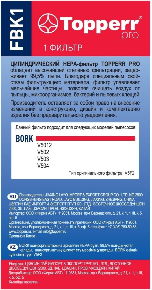 | Совместимые модели пылесосов | для пылесосов Bork V502, V503, V504, V5012 DUO (V5F2) |