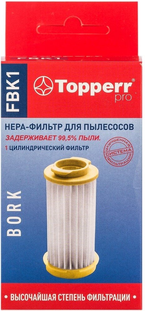 Цилиндрический HEPA-фильтр для пылесосов BORK. Обладает высочайшей степенью фильтрации, задерживает 99,5% пыли. Благодаря специальным свойствам фильтрующего материала, фильтр улавливает мельчайшие частицы, позволяя очищать воздух от пыльцы, микроорганизмов, бактерий и пылевых клещей.