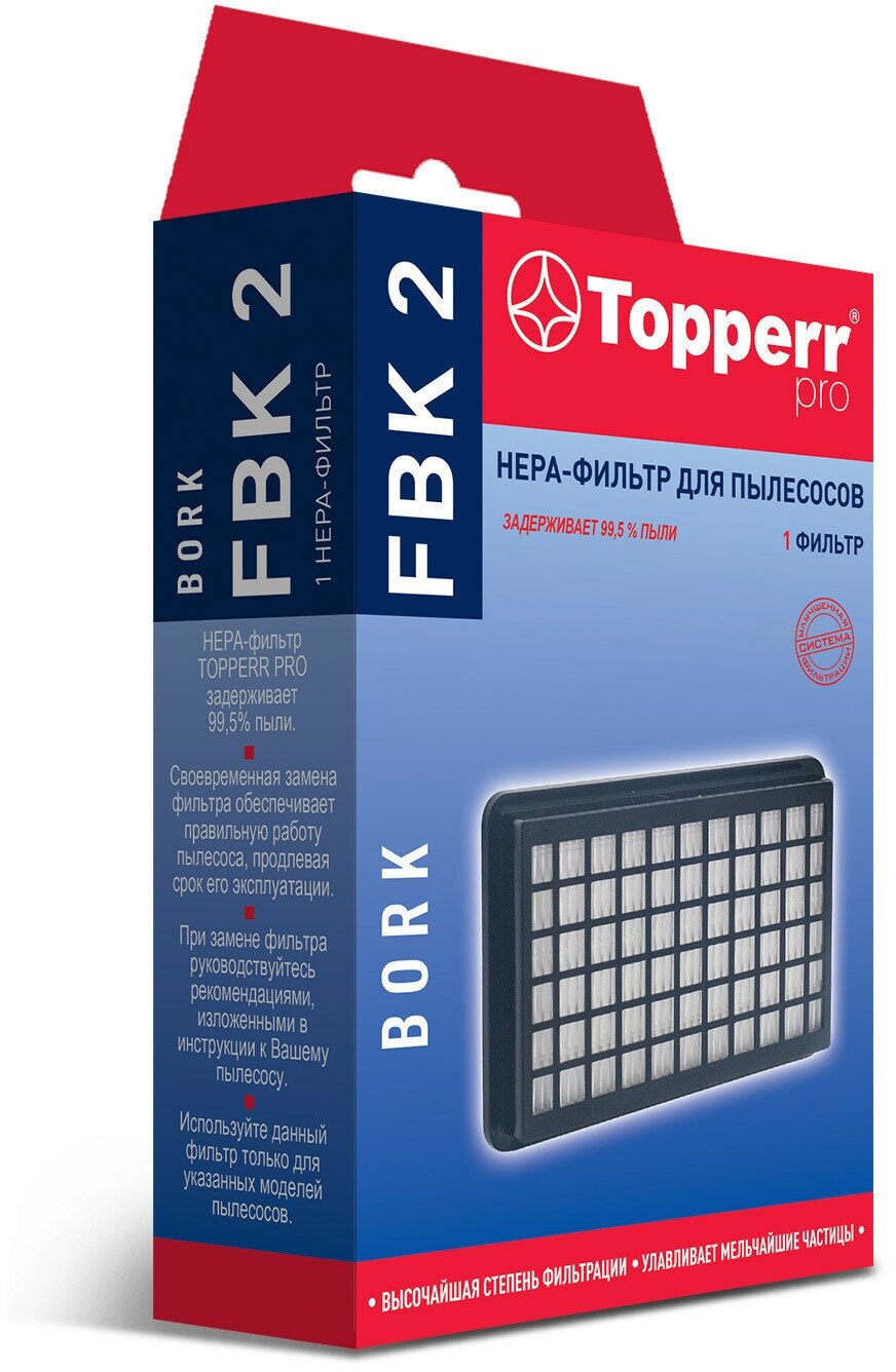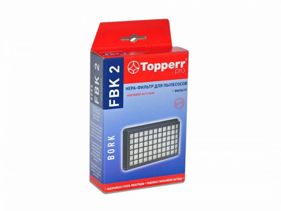 | Прочие особенности и свойства | HEPA-фильтр FBK 2 для пылесосов BORK. Обладает высочайшей степенью фильтрации, задерживает 99,5% пыли. Благодаря специальным свойствам фильтрующего материала, фильтр улавливает мельчайшие частицы, позволяя очищать воздух от пыльцы, микроорганизмов, бактерий и пылевых клещей. |