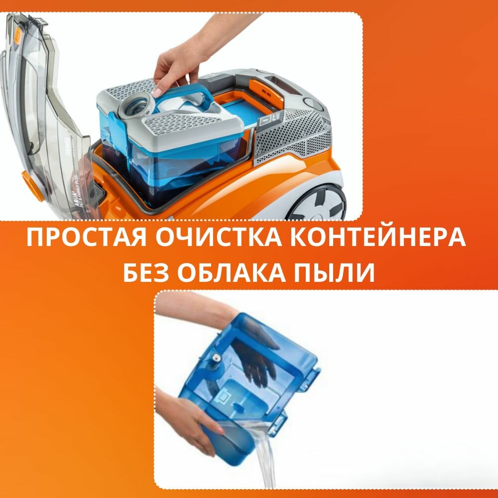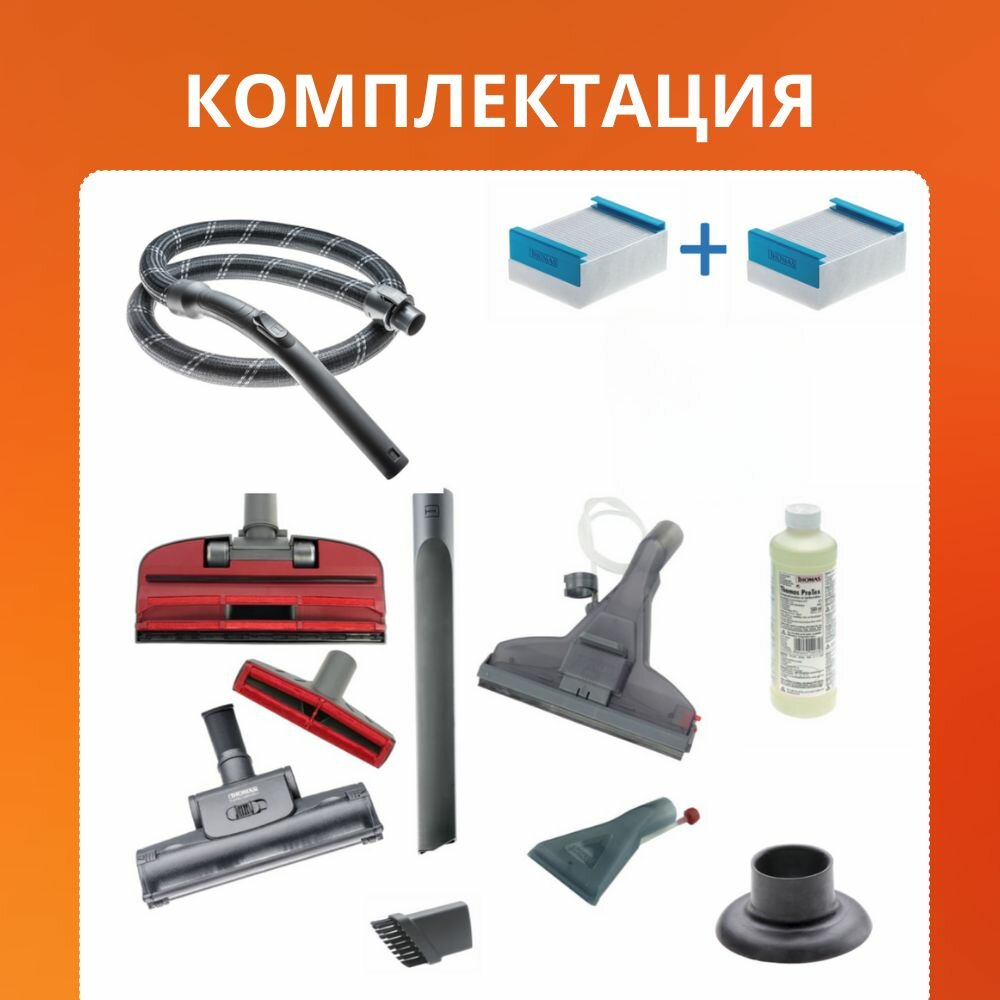 | Прочие особенности и свойства | Эксперт в уборке шерсти. Пылесос-универсал:уборка без мешка (технология Thomas Aqua-Box), уборка с мешком, влажная уборка, сбор воды, очистка и увлажнение воздуха. Специальные насадки для уборки за домашними питомцами. MADE IN GERMANY • Технология AQUA-BOX • Мешок пылесборник для экстренной уборки • Специальный гигиенический фильтр, моющийся • MICRO-фильтр выходящего воздуха • Специальная система распыления • Наружный съёмный резервуар объёмом 1,8 л для моющего раствора • Электронное управление «Touch–Tronic» • Защита мебели благодаря защитным вставкам • 3-х ступенчатое регулируемое электронное управление • Интегрированный функциональный переключатель «Softtouch» • Рукоятка Comfort-Softtouch с интегрированной гашеткой и шлангом для подачи воды • 360°-ролики повышенной проходимости • Популярные насадки всегда под рукой – специальные гнезда для насадок на корпусе • 2 положения парковки • Автоматическая смотка кабеля • Длина кабеля - 8 м • Радиус действия – 11 м • Брызгозащищенный корпус |