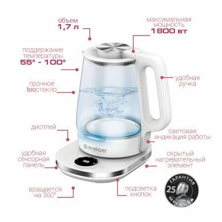 | Прочие особенности и свойства | Выбор температуры подогрева воды:55°С / 65°С / 75°С / 85°С / 95°С / 100°С Автоотключение при закипании Автоотключение при отсутствии воды Корпус из высокопрочного BIO-стекла Стильная подсветка-индикатор работы Светодиодный дисплей, отображающийтемпературу воды внутри чайника Отсек для хранения шнура Эргономичная ненагревающаяся ручка Беспроводное соединение позволяет вращать чайник на подставке на 360° Скрытый нагревательный элемент Световой индикатор включения |