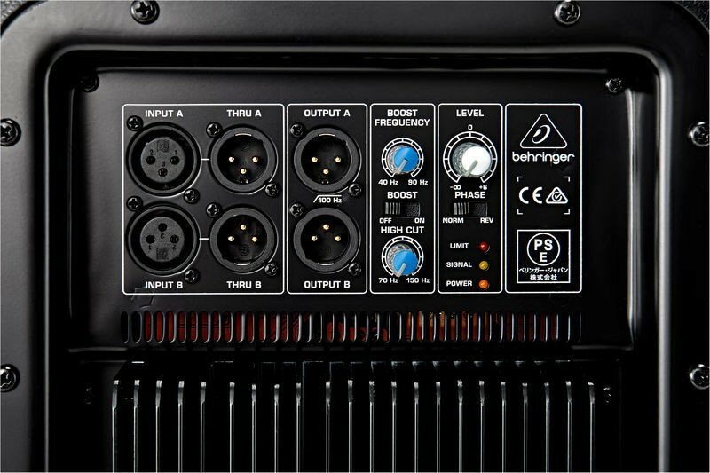 На задней панели кабинета расположены входы выходы коммутации - 2 x XLR. Частотный диапазон сабвуфера при -10dB составляет 32Hz - 200Hz, максимальное звуковое давление 128dB (1м). Производитель, компания BEHRINGER является известным брендом, который производит широкий спектр музыкального оборудования для общего и профессионального использования по весьма демократичной цене. Для установки сателлитов есть гнездо для стойки на верхней панели (опционально некоторые модели). Кабинет сабвуфера имеет достаточно небольшую форму и размеры (608 х 467 х 532 мм), вес - 34,4 кг.