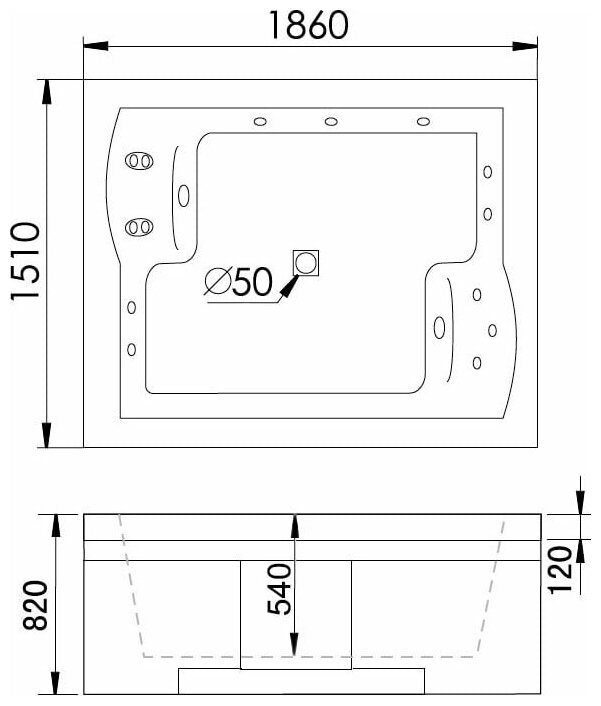 - Размер ванны (ДхШхВ): 186х151х82 см.