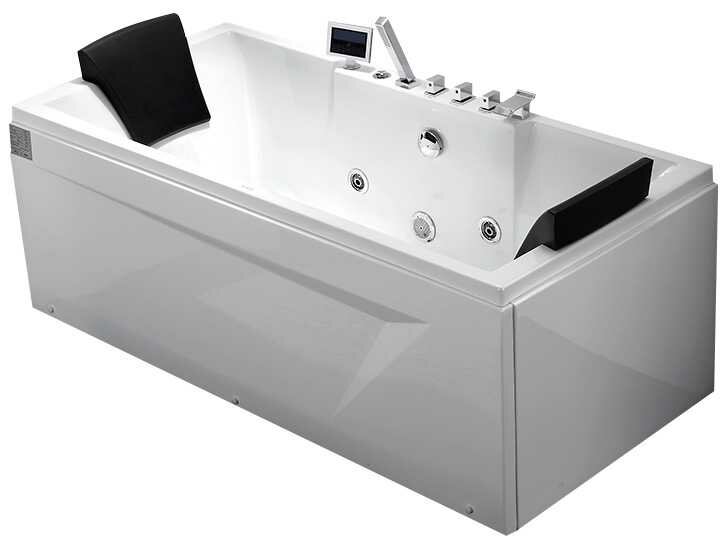 прямоугольная акриловая ванна белого цвета. На каркасе, слив-перелив в комплекте. Подголовник, смеситель с изливом, душевая лейка, съемная панель, хромотерапия, гидромассаж, аэромассаж, тип управления электронное.