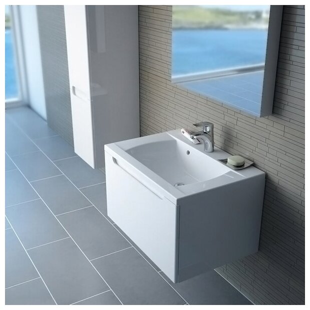 Боковой пенал с двумя стеклянными полками и практичным ящиком в верхней части образуют компактную стильную составляющую любой ванной комнаты, подчеркнутую эргономичным вырезом, выполняющим функцию ручки. Представленные в нескольких цветах корпуса пеналов всегда идут в комбинации с белыми глянцевыми дверцами.