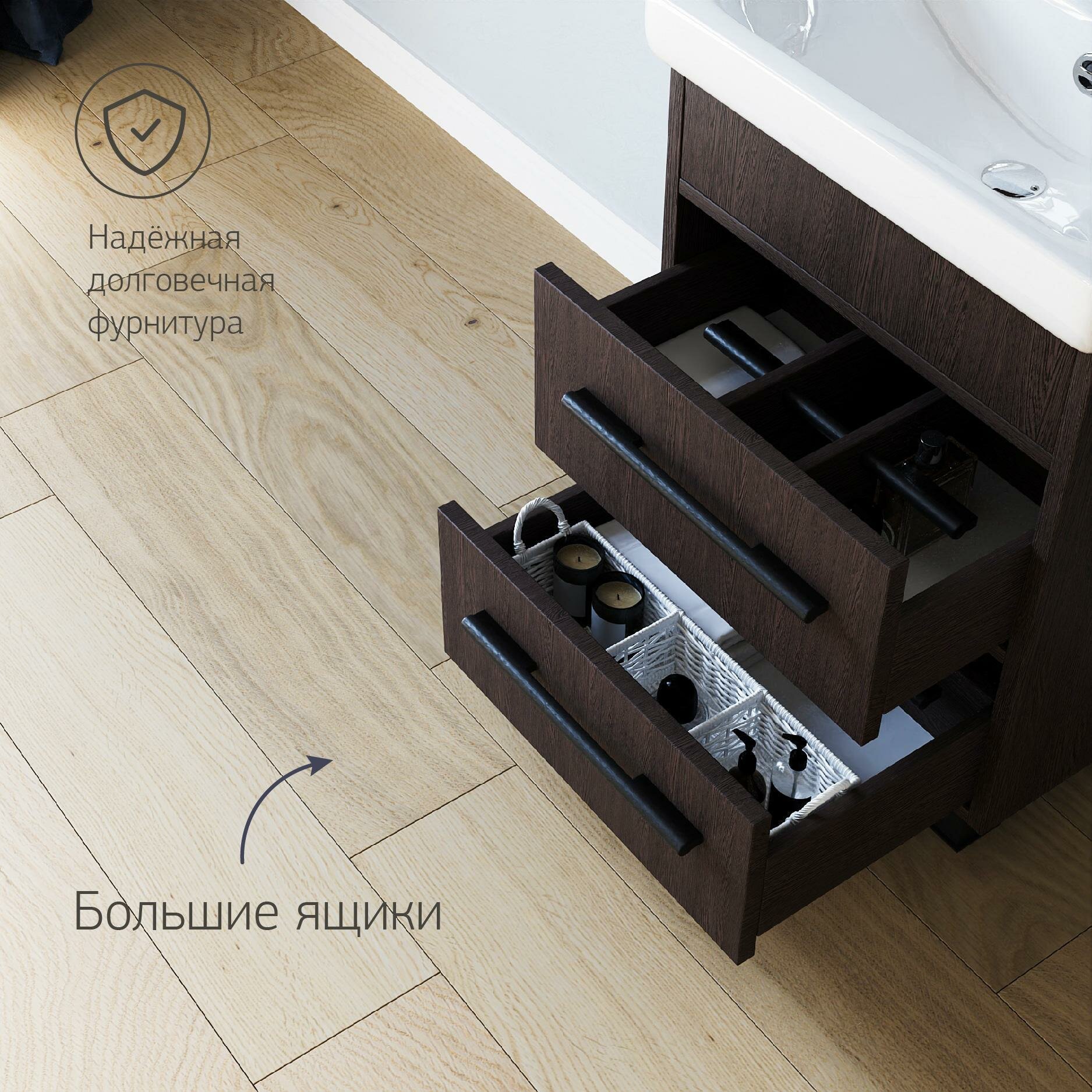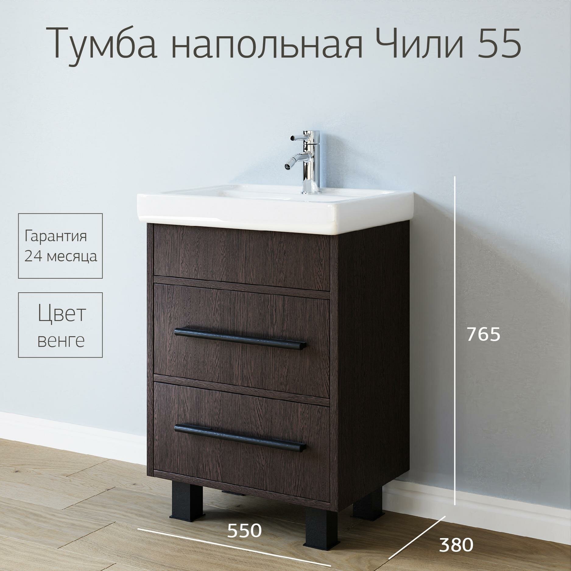 Сочные краски: ослепительная белизна фаянсовой чаши-раковины и шоколадный фасад. Блеск хромированной фурнитуры – удлиненные ручки на передних панелях выдвижных ящиков и кубической формы ножки. Глубина, сдержанность, умиротворение – в каждой линии модели «». Эта компактная и функциональная тумба с раковиной придется по вкусу приверженцам минимализма в интерьере. Подарите пространству атмосферу безукоризненной чистоты и организованного порядка с тумбой «». Функциональность: Два выдвижных ящика. Для установки сифона верхний ящик разделен на две части. Отверстия в задней планке для крепления к стене. Задняя стенка отсутствует для подводки труб. Фурнитура: Две ручки. Для тумбы 55 - три пластиковые опоры (декоративные спереди и поддерживающая сзади).Раковина в комплекте: Для тумбы Чили 55 - Раковина тигода 55 мини
