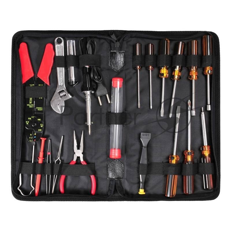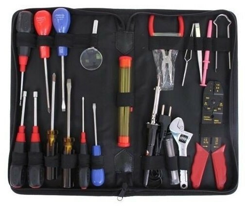Пассатижи 130 мм Отвертка 75 х 3 прямая. Отвертка 75 х 3 крестовая. Отвертка 75 х 5 прямая. Отвертка 75 х 5 крестовая. Отвертка 100 х 6 прямая. Отвертка 100 х 6 крестовая. Отвертка с двумя сменными жалами. Торцевой ключ 1/4. Торцевой ключ 3/16. Разводной ключ 150 мм. Инструмент для разделки кабеля. Бокс для мелких деталей. Инсертер для микросхем. Экстрактор для микросхем. Паяльник. Припой. Зацеп. Два пинцета разных типов. Футляр для хранения: папка.