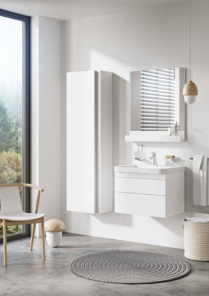 Зеркало, относящееся к инновационной концепции для ванных комнат 10°, обладает встроенной практичной полкой, исполнение которой совпадает с одной из трех предлагаемых расцветок мебели 10°.