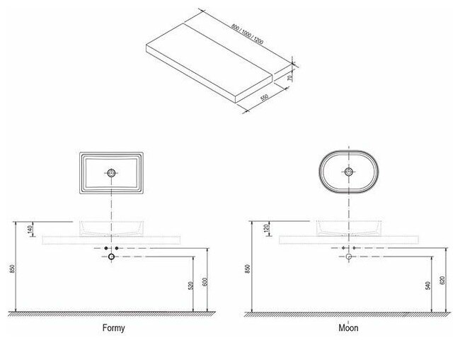 Универсальная столешница, подходящая под большинство умывальников. Представлена в трех цветах и трех материалах, поставляется без просверленного отверстия.