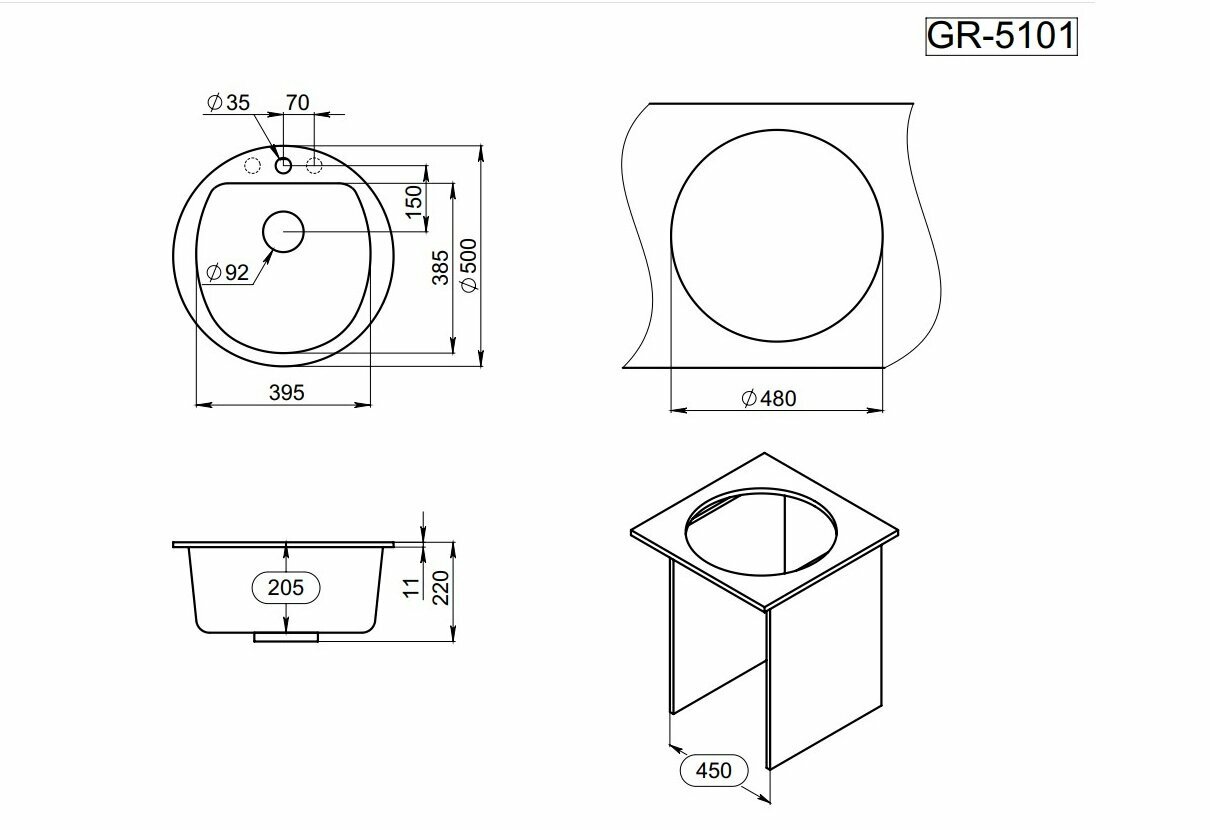 Круглая кухонная мойка Granula GR-5101. Цвет: базальт.