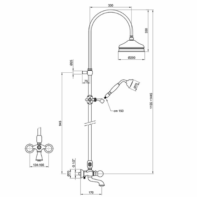 Душевая стойка Webert Karenina KA721208010 с кристаллами Swarovski, с круглым верхним душем, с двухвентильным смесителем с изливом. Излив 170 мм. Стандарт подключения G1/2. Расстояние между центрами креплений: 134-166 мм. Душ 200 мм.Длина кронштейна: 330 мм. Ручной душ75 мм. Шланг 1500 мм.