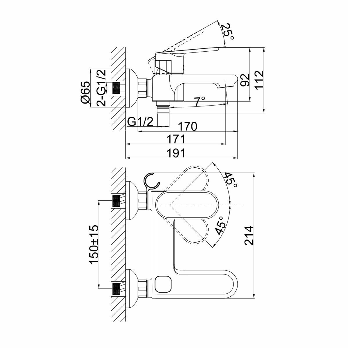 Смеситель для ванны D&K Rhein Speyer DA1313201 с коротким изливом и душевым гарнитуром, однорычажный, на два отверстия для монтажа.