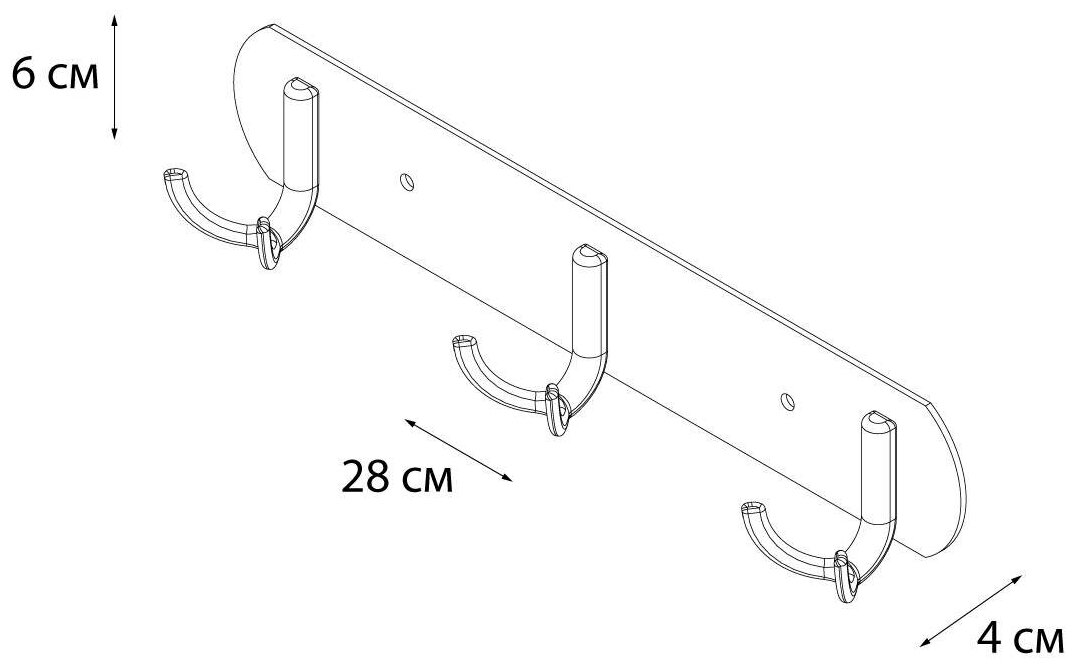 планка 3 крючка, монтаж: настенный. Ширина: 27,8. Высота: 6 см. Глубина: 4,2 см. Метод крепления: шурупы. Тип рисунка: без рисунка. Фактура: гладкая. Форма: прямоугольная