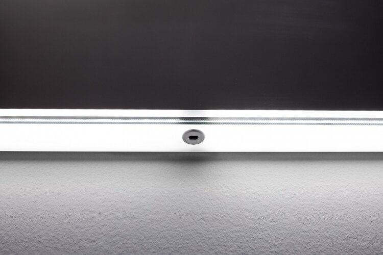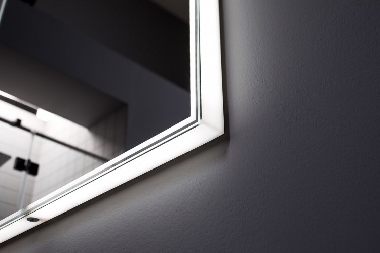 Зеркало Aquanet Палермо LED имеет универсальную установку. Тоненькая светящаяся полоска по всему периметру этого четырехугольного зеркала – LED-светильник. В верхней части она перетекает в широкую рамку. Зеркало будет симпатично смотреться в ванной и зрительно увеличит размер маленького помещения. Оно будет выглядеть единым комплектом с тумбой шириной 100 см. Но это если оно будет установлено, учитывая рекомендованную ориентацию. Варьируя расположение широкой полосы светильника, будет меняться не только облик самого изделия, но и размеры тумбы или раковины, которые необходимо подобрать в комплект. Правда, в этом случае следует учесть, что включение и выключение светильника происходит с помощью инфракрасного датчика, а он расположен в нижней части зеркала, то есть на той стороне, которая находится напротив широкой светящейся полосы. А потому, если придет в голову повесить зеркало вверх ногами, то включение подсветки будет проблематичным.