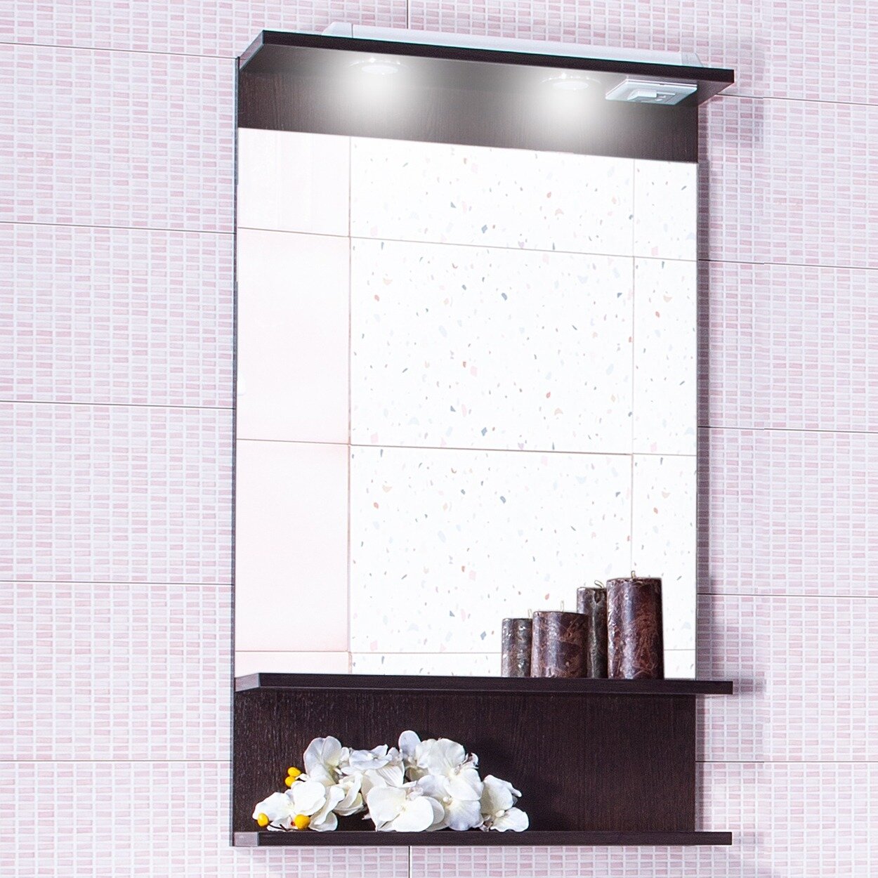 Зеркало Бриклаер Чили/Куба 55 в цвете Венге.- Изготовлено из влагостойкого ДСП, устойчиво к перепадам температур.- Горизонтальная полка под зеркалом.- Зеркальное полотно с защитным покрытием из серебра и амальгамы.- Два галогеновых светильника со сменными лампами 12V. - Выключатель с розеткой, шнур длиной 50 см для подключения к электросети 220В.В комплекте поставки: зеркало.