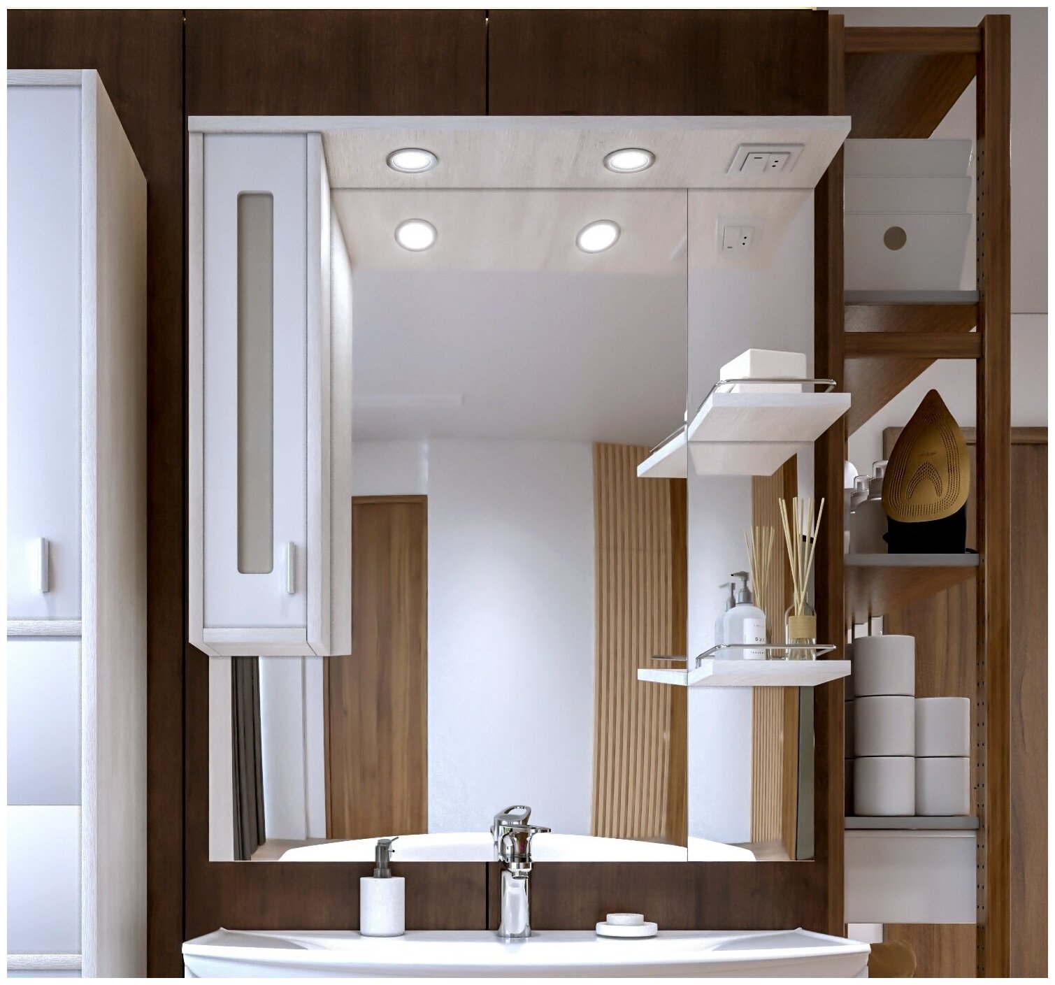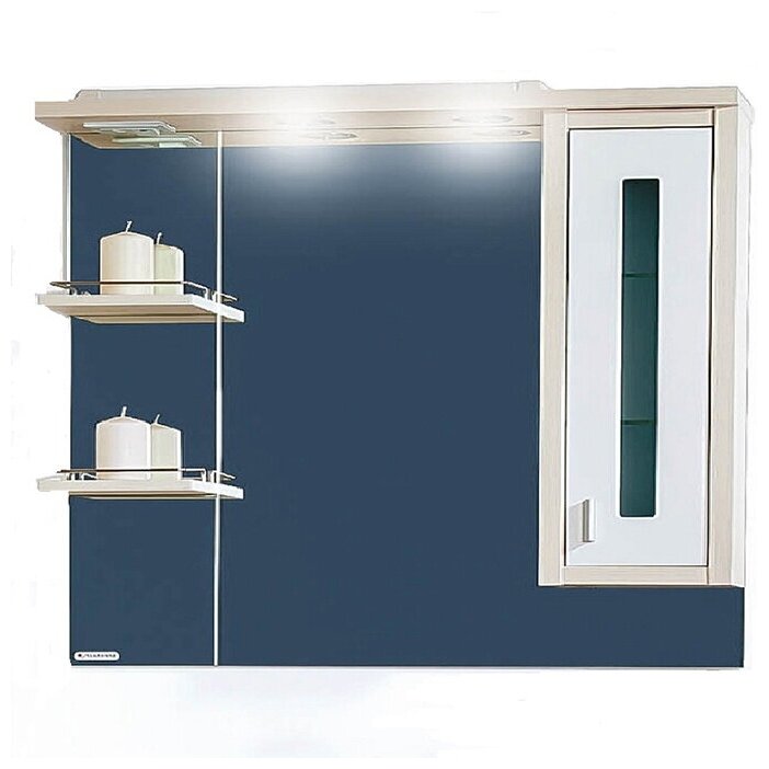 Зеркало Бали 90 изготавливается с правым и левым расположением шкафчика. Внутри шкафчика находится две полки. На верхней планке зеркала находится подсветка, в виде двух галогеновых встраиваемых светильников, по 20 Ватт каждый, которые подключены с помощью трансформатора 12Вт. Рядом со светильниками находится розетка на 220 Вт.