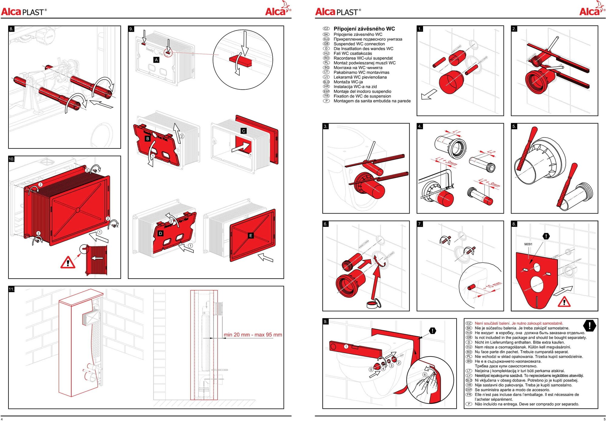 Инсталляция для унитаза AlcaPlast Solomodul AM116/1120 предполагает скрытый монтаж внутри стены. Скрытая система инсталляции предназначена для сухой установки (в пространство) подвесных унитазов. Допустим монтаж в гипсокартонных конструкциях. Рекомендуется совершать установку на пол с толщиной стяжки 0–150 мм. Установка подвесного унитаза на инсталляцию предполагается с интервалом крепления 180 мм или 230 мм. Модель комплектуется регулируемыми выдвижными ножками с возможностью изменения высоты в диапазоне 0–200 мм с тормозной системой. Изделие оснащено подвижным держателем для стокового колена, устанавливаемым в восьми положениях на расстоянии 0–45 мм, и угловым вентилем с возможностью подключения к системе трубопроводов Mepla. Конструкция рамы позволяет производить монтаж к профилю для гипсокартона, предназначенного для этих целей, или к несущей стене. Установленная система закрывается гипсокартонным листом и не нуждается в дополнительных крепежных элементах. Конструкция полистирольной изоляции предотвращает процесс конденсации на поверхности бачка и ослабляет вибрацию в строительной конструкции. Предусмотрена возможность установки кронштейна с переходом DG 1/2" для подключения сиденья-биде или бидетты. В изделии двойной смыв, независимо регулируемый, с гигиеническим резервом. Подходит для установки пневматического или сенсорного смыва. Инсталляция совместима со всеми кнопками управления Alcaplast. Дополнительным преимуществом модели является возможность сервиса без использования инструментов. Подвод воды сзади/сверху посередине. Бачок сделан из одного фрагмента полипропилена, что обеспечивает его 100% герметичность. Крышка сервисного отверстия упрощает процесс монтажа и защищает от влаги и грязи. Монтажная глубина рукава регулируется в диапазоне 20–95 мм. Монтажная глубина - 200 мм. Материал несущей конструкции: металл, обработанный порошковой краской.
