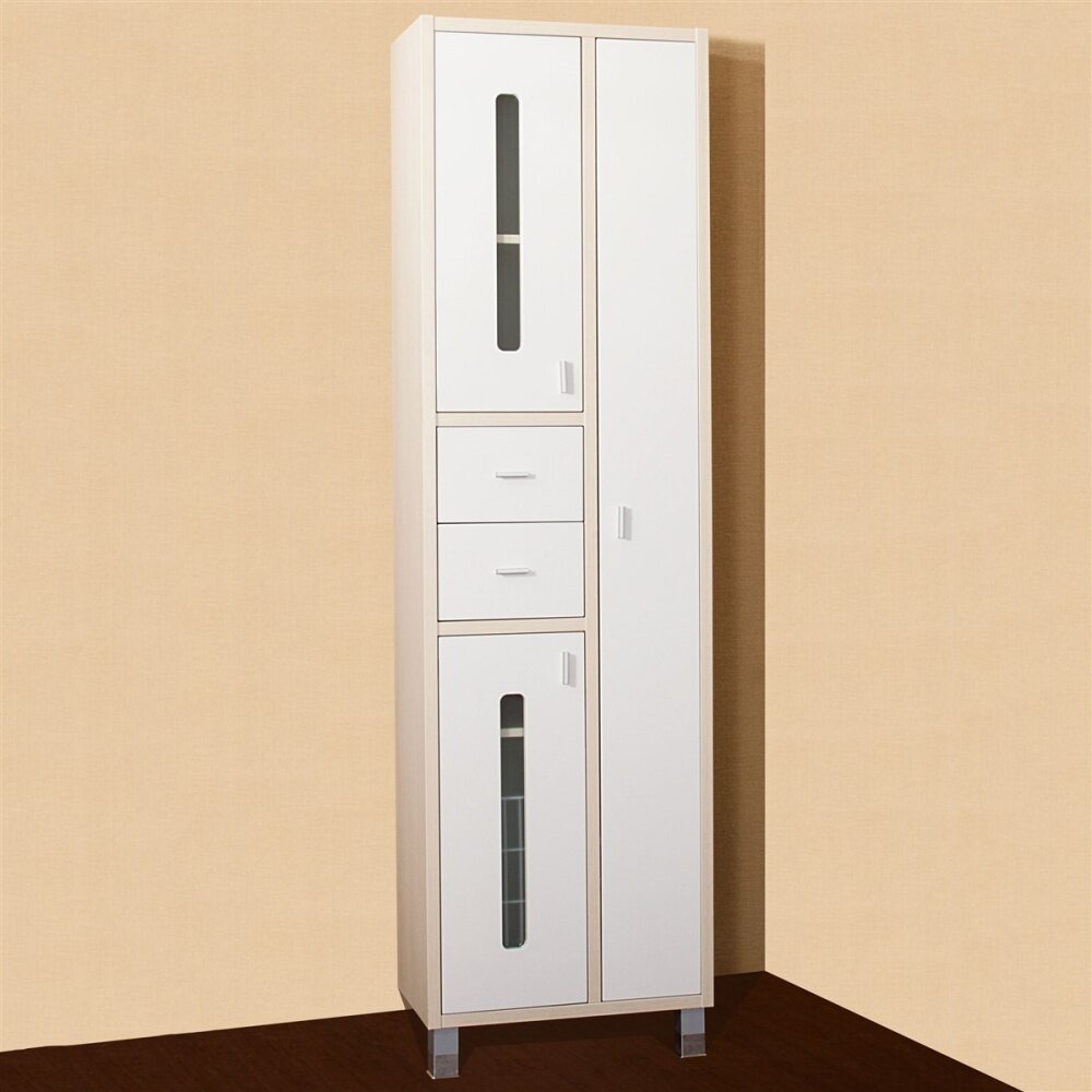 Пенал для ванной комнаты, две секции с распашными дверцами и разделительными полочками, два выдвижных ящика, съемная корзина для белья, дверцы со стеклом.