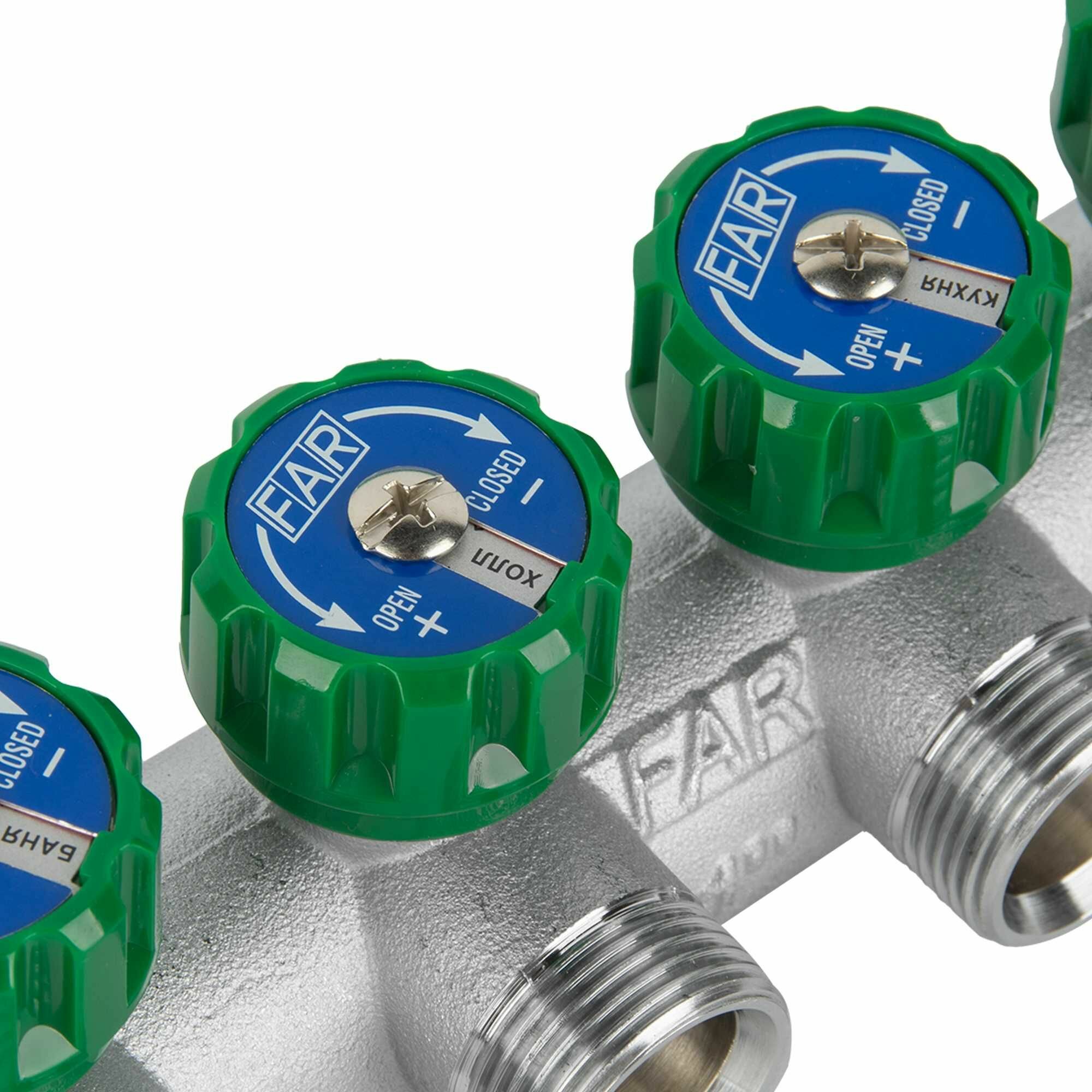 Хромированный регулирующий проходной коллектор Far (ВР-НР) с 4 отводами (ТР) артикул FK 3824 134 (отводы 3/4", коллектор 1")