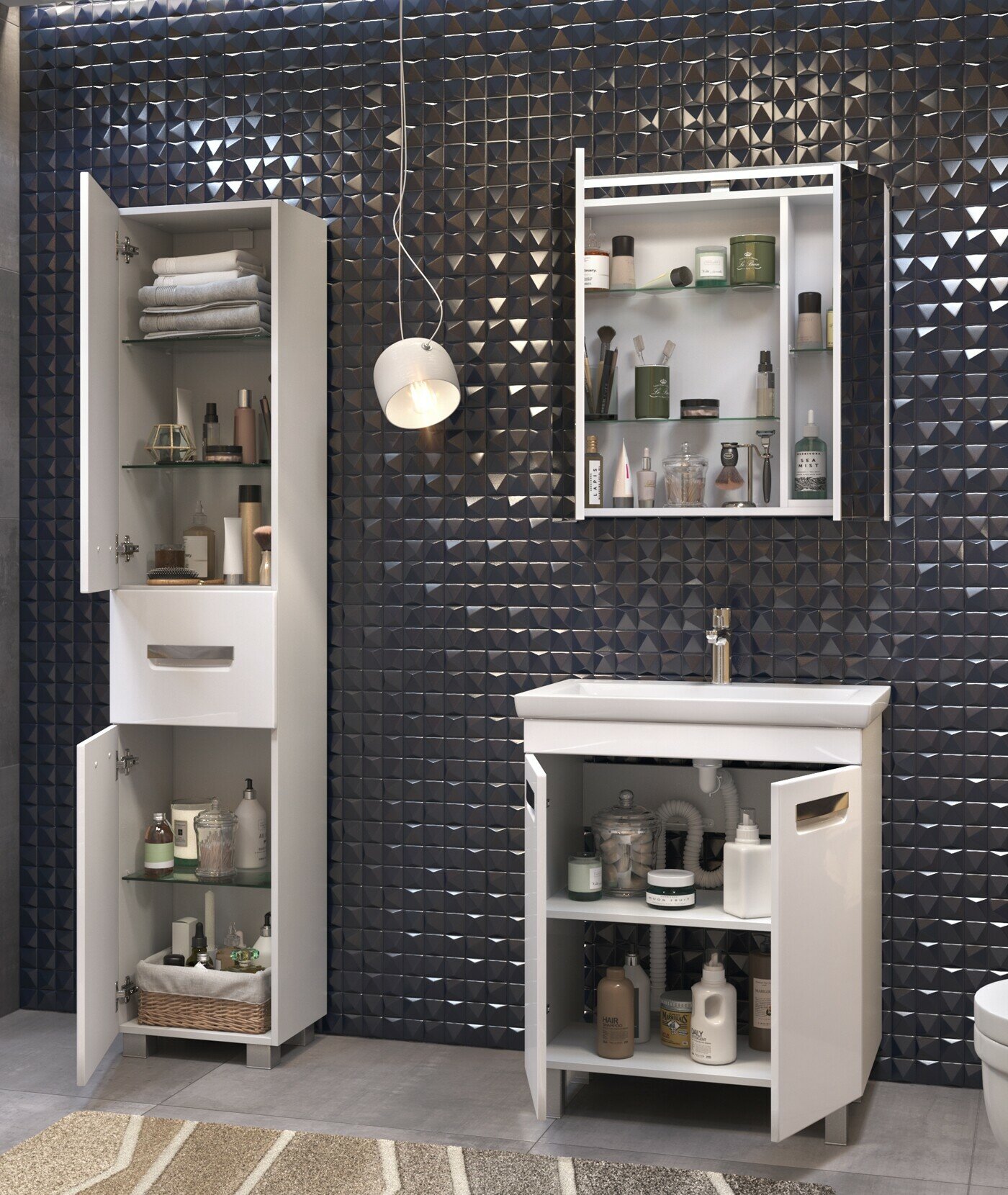 Лаконичная форма и удобная система хранения позволит с комфортом использовать тумбу в Вашей ванной комнате. Идеально подходит для интерьера в современном стиле.