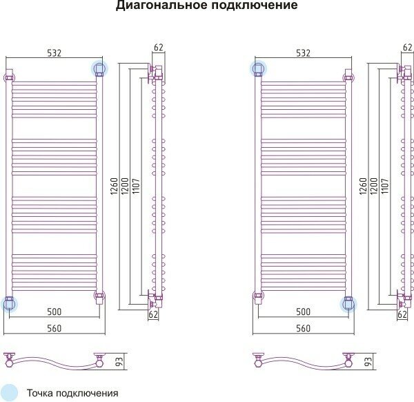 Технические характеристики:- Межосевое расстояние: нижнее подключение X (мм): 500, диагональное подключение Y (мм): 1200, вертикальное подключение Y (мм): 1200,