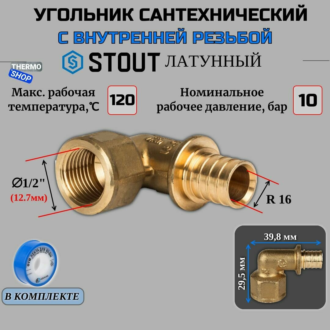 **Угольник-переходник Stout** позволяет повернуть трубопровод на 90°. Используется в системах горячего и холодного водоснабжения (в том числе питьевого), газоснабжения, отопления. Под соединение с трубами устроена наружная/внутренняя резьба диаметром 16x1/2". Фитинг выполнен из латуни. Выдерживает воздействие высоких температур и давления, устойчив к коррозии, не выделяет вредных веществ, эстетично выглядит, долго служит.