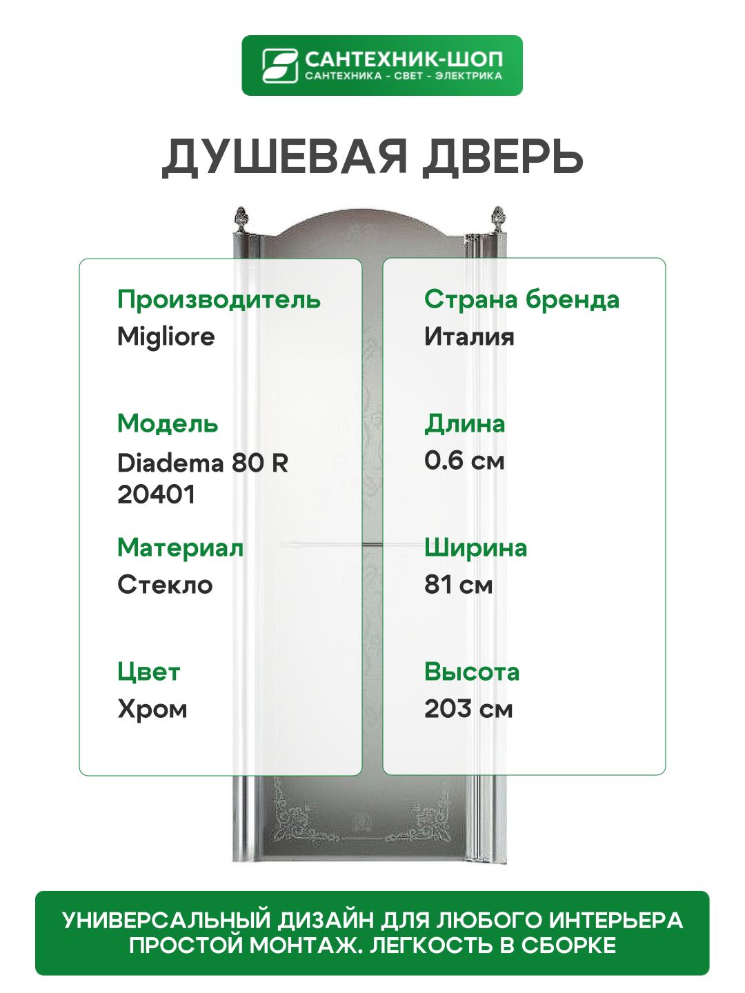 Душевая дверь в нишу Migliore Diadema 80x195 R профиль Хром стекло Матовое с декором