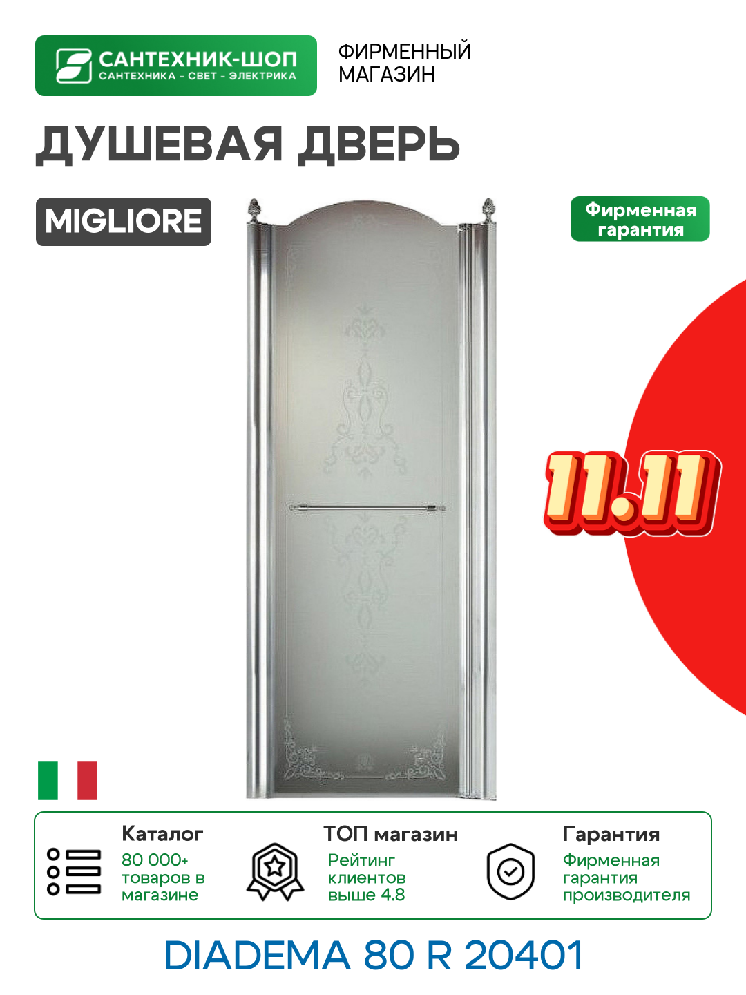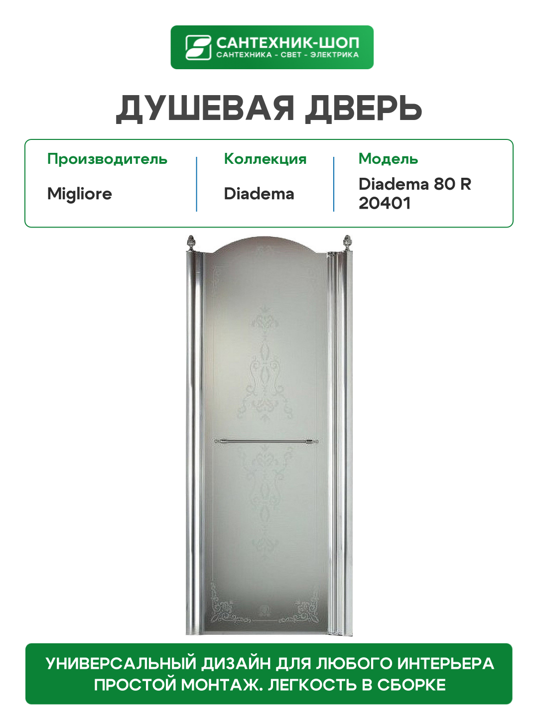 Стеклянная душевая дверь в нишу Migliore Diadema 80 R 20401 с одной распашной створкой. Уникальная дизайнерская дверь в ретро стиле от итальянской компании Migliore.