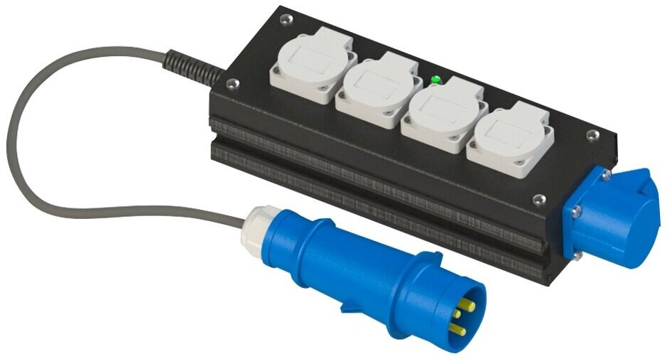 Коммутация: питание осуществляется через силовую вилку CEE16A 3-pol. на 2х-метровом кабеле H07RN-F 3G2,5 (длина кабеля может быть изменена под индивидуальный размер), выход через 4 розетки Schuko16A с заземлением и защитными крышками и силовую розетку РСЕ СЕЕ 16А 3-роI.