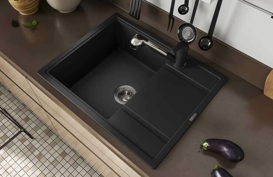 - Композитный материал устойчив к механическим повреждениям и воздействиям высокой температуры. Благодаря низкой пористости поверхность кухонной мойки не впитывает грязь.