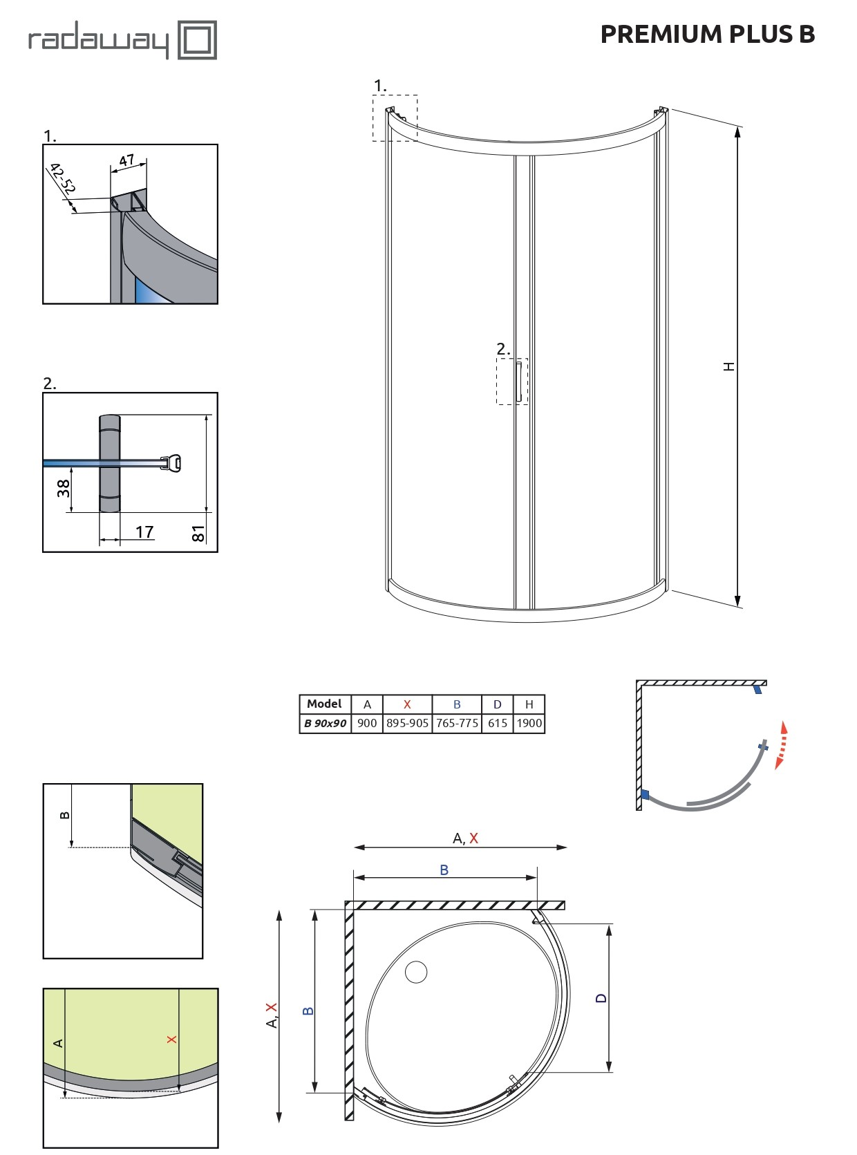 Стеклянный душевой уголок Radaway Premium Plus B 1900 90x90 30473-01-05N в форме четверти круга, с одной раздвижной дверью, с элегантной хромированной фурнитурой. Устанавливается на поддон или непосредственно на пол. Прочное закаленное стекло безопасно в случаях повреждений. Магнитные уплотнители на двери обеспечивают герметичность и устойчивы к влаге и изменениям температуры. Для простоты очистки предусмотрена расфиксация двери.