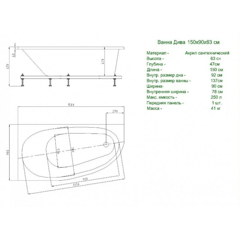 Ариловая ванна Акватек Дива DIV150-0000001 левая без каркаса, фронтального экрана и слив-перелива. Будьте, пожалуйста, внимательны при выборе ориентации (левая/правая) ванны. Ориентация ванны определяется по сливу.