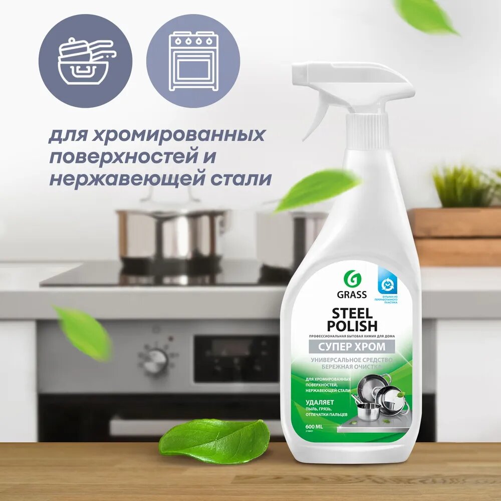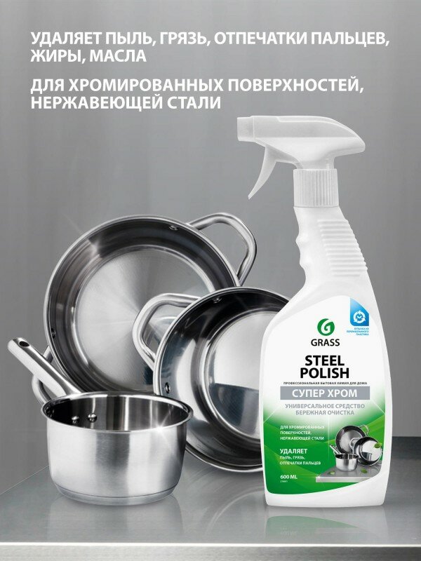 Очиститель для нержавеющей стали Steel Polish. Средство для очистки изделий из нержавеющей стали, меди, латуни, хромированных, никелированных, эмалированных, а также других твердых поверхностей, требующих бережного обращения. Эффективно удаляет пыль, грязь, отпечатки пальцев, жиры, масла, пятна от воды и другие загрязнения. Оставляет невидимый защитный слой, который облегчает последующую чистку поверхности.