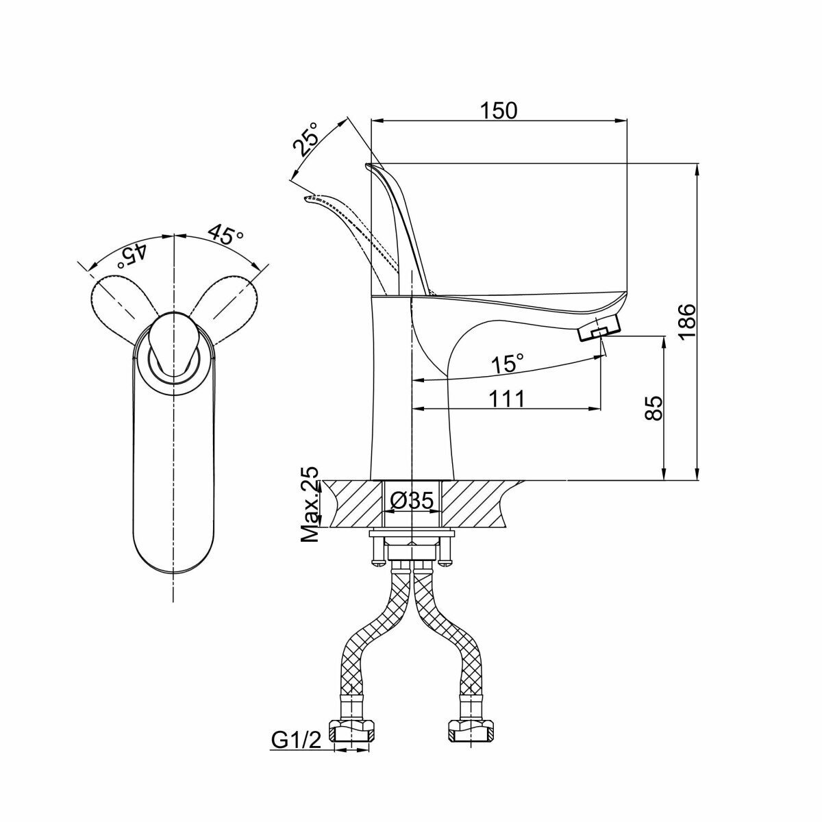Смеситель для раковины D&K Venice.Baciano DA1032159, черный Гарантия - 5 лет. Бесплатное сервисное обслуживание "D&K" - 10 лет.* Смесители немецкого бренда "D&K" производятся из латуни класса «А», что соответствует стандартам латуни HPB59-1, в РФ марка ЛЦ40С (ГОСТ 15527-2004) Толщина стенок смесителей «D&K» составляет 2,5 – 3,5 мм, Картридж D-35 мм. с высокопрочными пластинами из минерала Корунд (Al₂O₃) оксида алюминия. Низкий уровень шума: 17-19 дБ (сопоставим с шелестом листвы). Количество циклов открытия/закрытия - 500 000 Изделие тестируются под давлением воды и воздуха от 3 Атм до 10 Атм, на работоспособность комплектующих и качества сборки в соответствие стандартам. Ручка - джойстик с лепестком под пальцы. Высота смесителя: 186 мм. Длина излива: 150 мм. Пластиковый аэратор установлен под углом для комфортной эксплуатации, уменьшает расход воды. Креплление: Гайка с фиксирующими винтами Гибкая подводка на 1/2" - 40см.