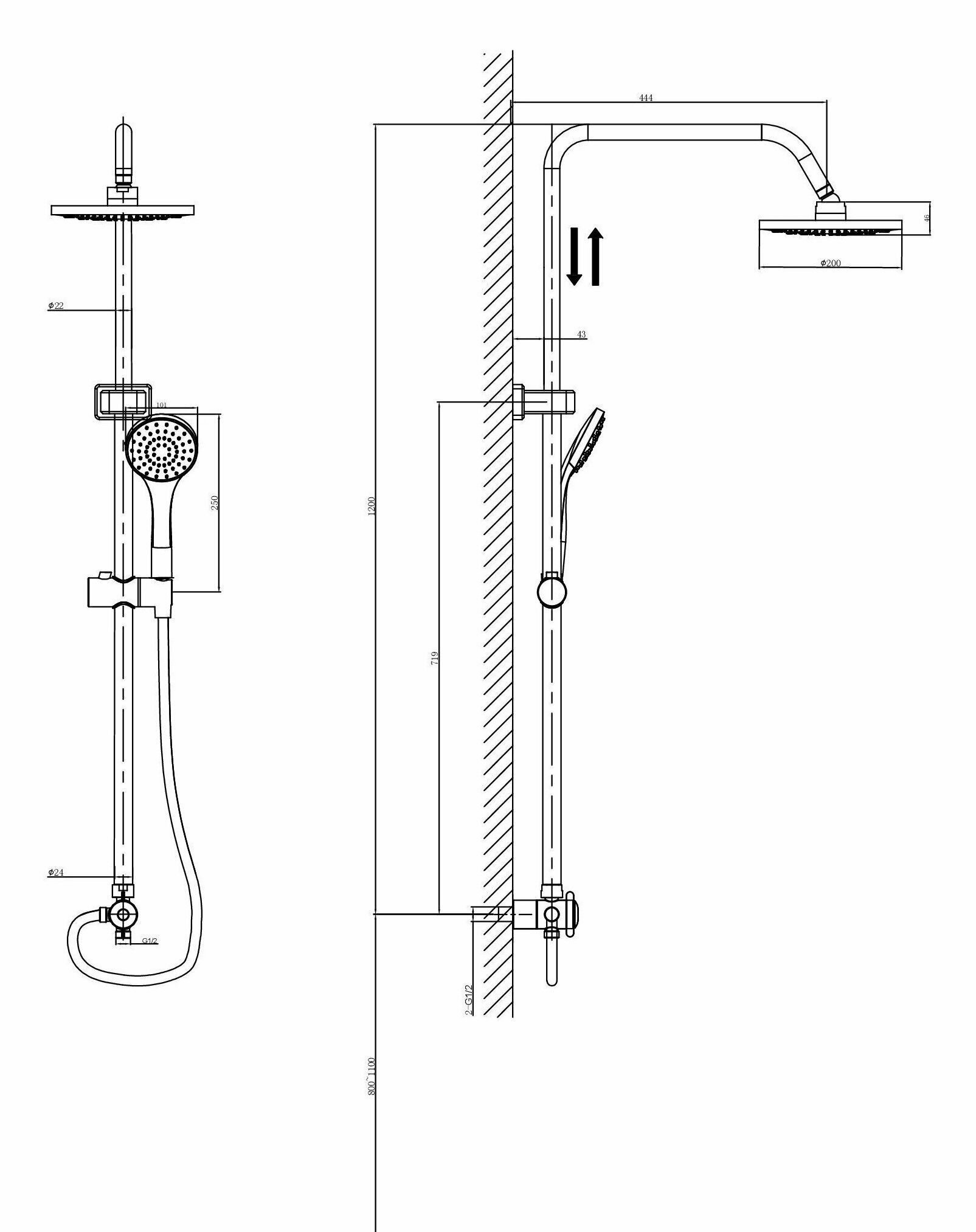 Душевая штанга с подключением и держателем для душевой лейки, латунь, хромированная поверхность.