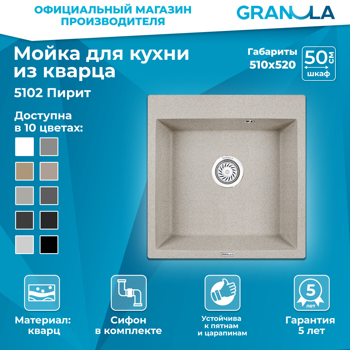 Мойка кухонная GRANULA GR-5102 кварцевая 505*510 мм арктик. Квадратная кухонная мойка с глубокой и очень просторной чашей - 440х405мм.