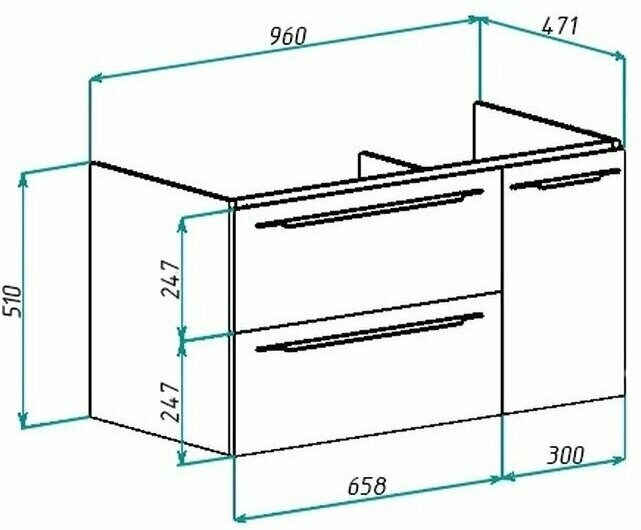 Размеры: Тумба под раковину (ш/в/г): 960х510х471 мм КомплектацияТумба для комплекта 1 шт. Комплект креплений 1 шт. Комплект доводчиков 1 шт. Инструкция 1 шт.