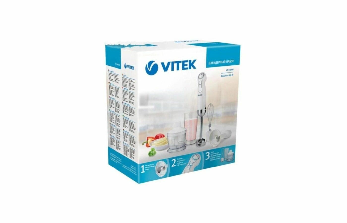 Погружной блендер VITEK поможет быстро приготовить ваши любимые блюда: пюре, муссы, молочные коктейли. Идеально соблюсти все пропорции рецептуры, взбить и смешать жидкие ингредиенты, готовить вкусные коктейли Вы можете, благодаря пластиковой чаше 400 мл. набора и мерному стакану объемом 500 мл входящему в комплект. Для особенно быстрого и мощного измельчения продуктов в нем также предусмотрен режим TURBO. Эта модель оборудована мотором мощностью 800 Вт. Благодаря ему взбивание, измельчение, пюрирование происходит за считаные секунды. Купите блендер и обеспечьте себе комфорт на кухне!