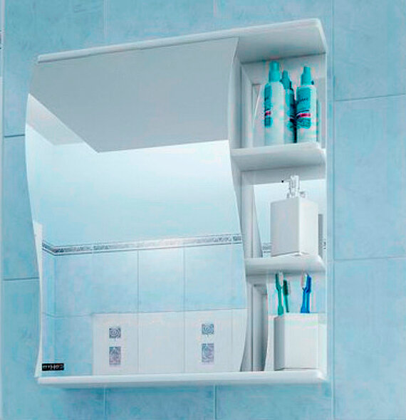 Зеркальный шкаф для ванной комнаты. Корпус изделия произведен из влагостойкого ДСП. Фасад изделия из МДФ с покрытием ПВХ пленкой методом мембранно-вакуумного прессования, что позволяет достичь почти 100% водонепроницаемости.