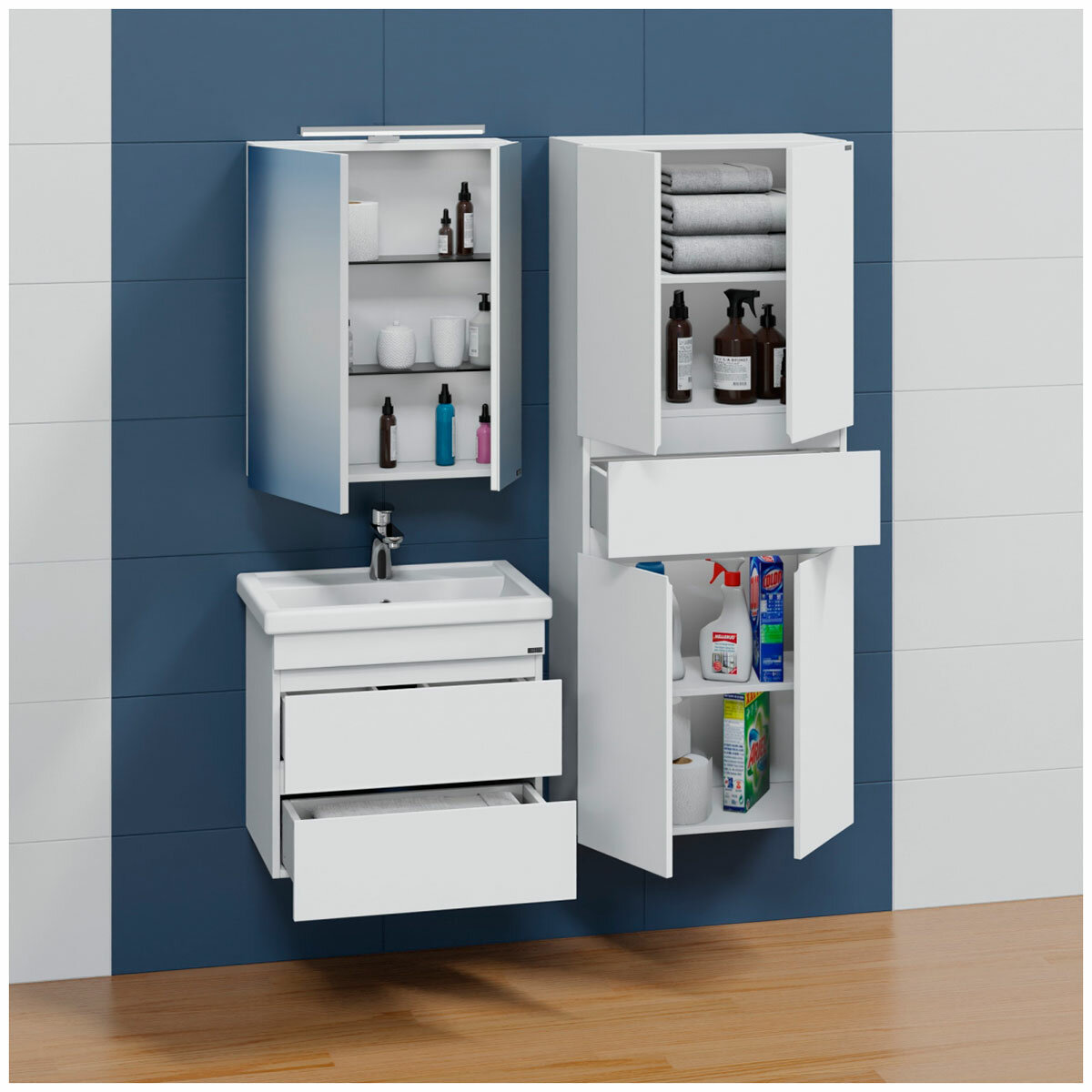 - Фасад и корпус шкафа выполнены из МДФ/ЛДСП. Материал покрыт пленкой высокого качества. Безупречная фрезеровка фасада и нанесение пленки гарантирует высокую влагостойкость и прочность.
