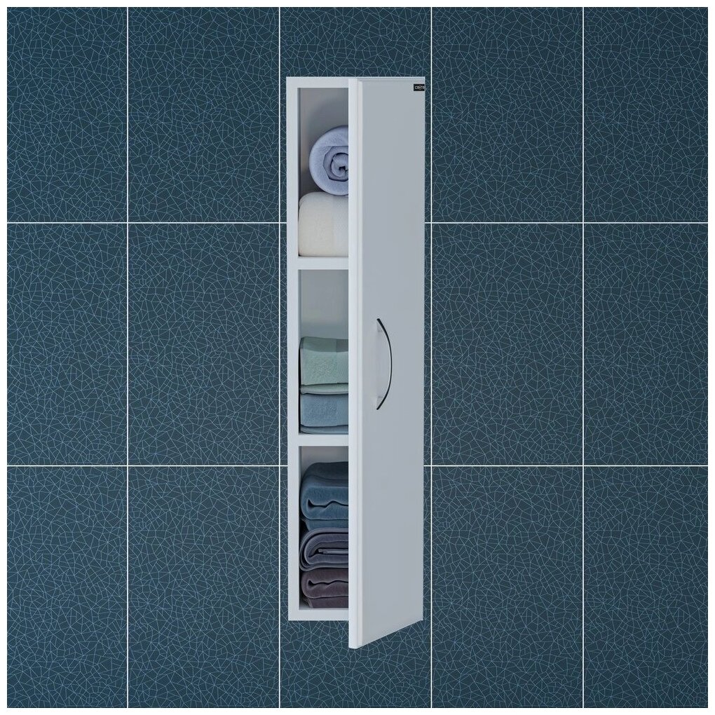 Подвесной шкаф для ванной комнаты. Корпус изделия произведен из влагостойкого ДСП. Фасад изделия из МДФ с покрытием ПВХ пленкой методом мембранно-вакуумного прессования, что позволяет достичь почти 100% водонепроницаемости.