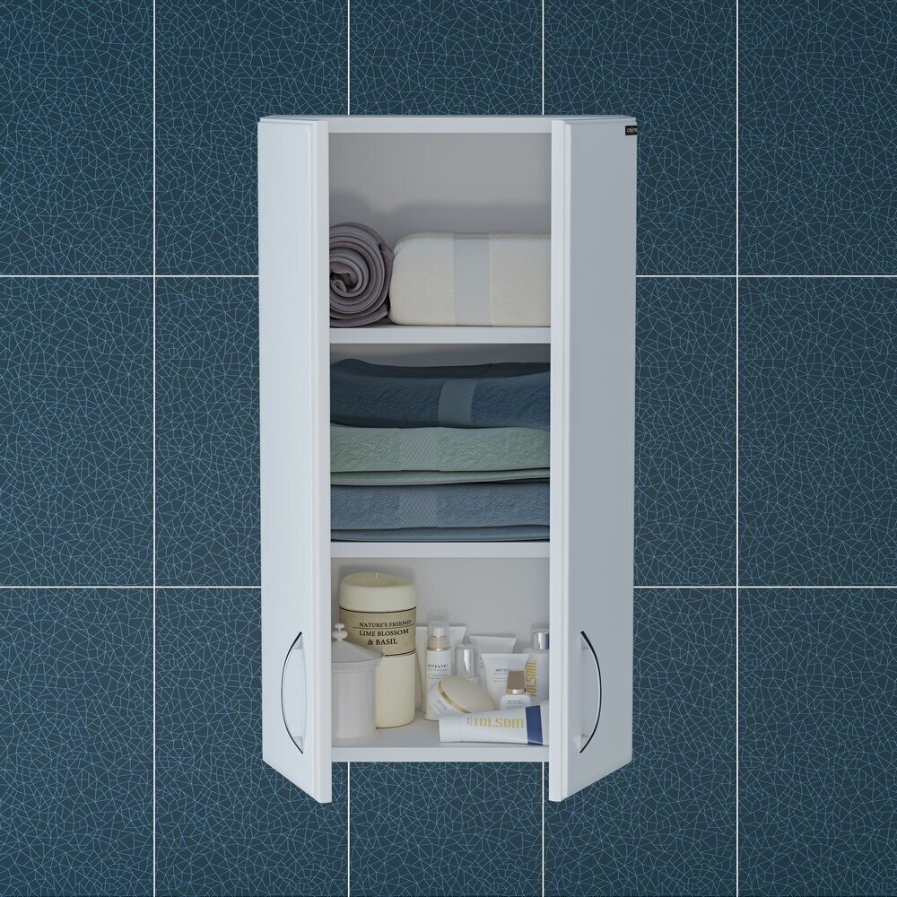 Подвесной шкаф для ванной комнаты. Корпус изделия произведен из влагостойкого ДСП. Фасад изделия из МДФ с покрытием ПВХ пленкой методом мембранно-вакуумного прессования, что позволяет достичь почти 100% водонепроницаемости.