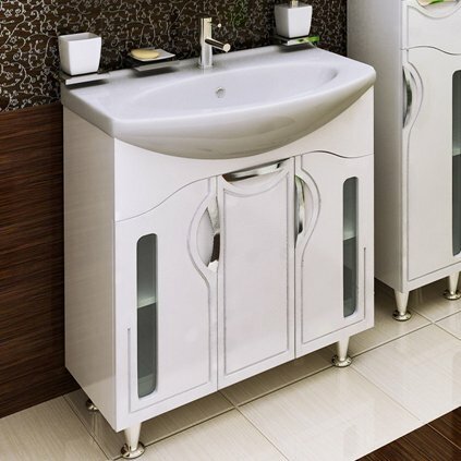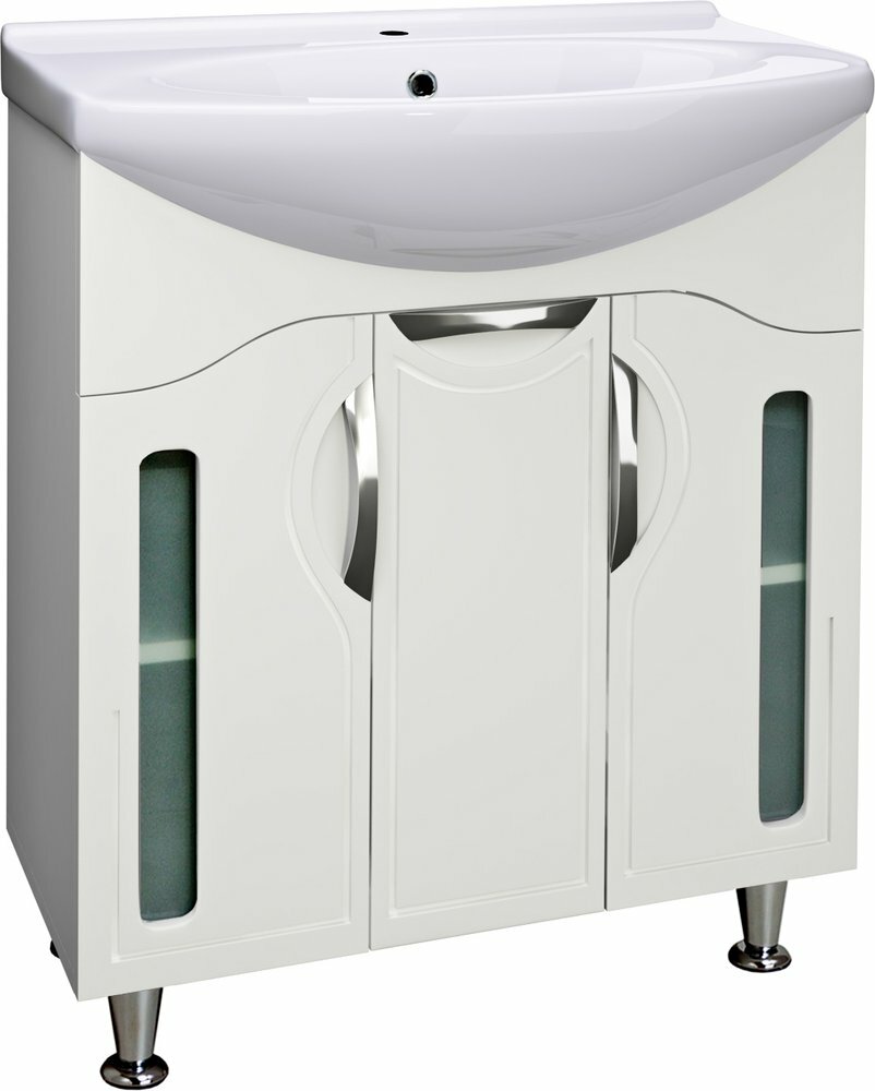 Тумба под умывальник напольная с тремя распашными фасадами со стеклянной вставкой и одной внутренней полкой. Петли со встроенным доводчиком, ручки врезные - 3 шт, ножки хром - 2 шт, ножки пластик - 2 шт.